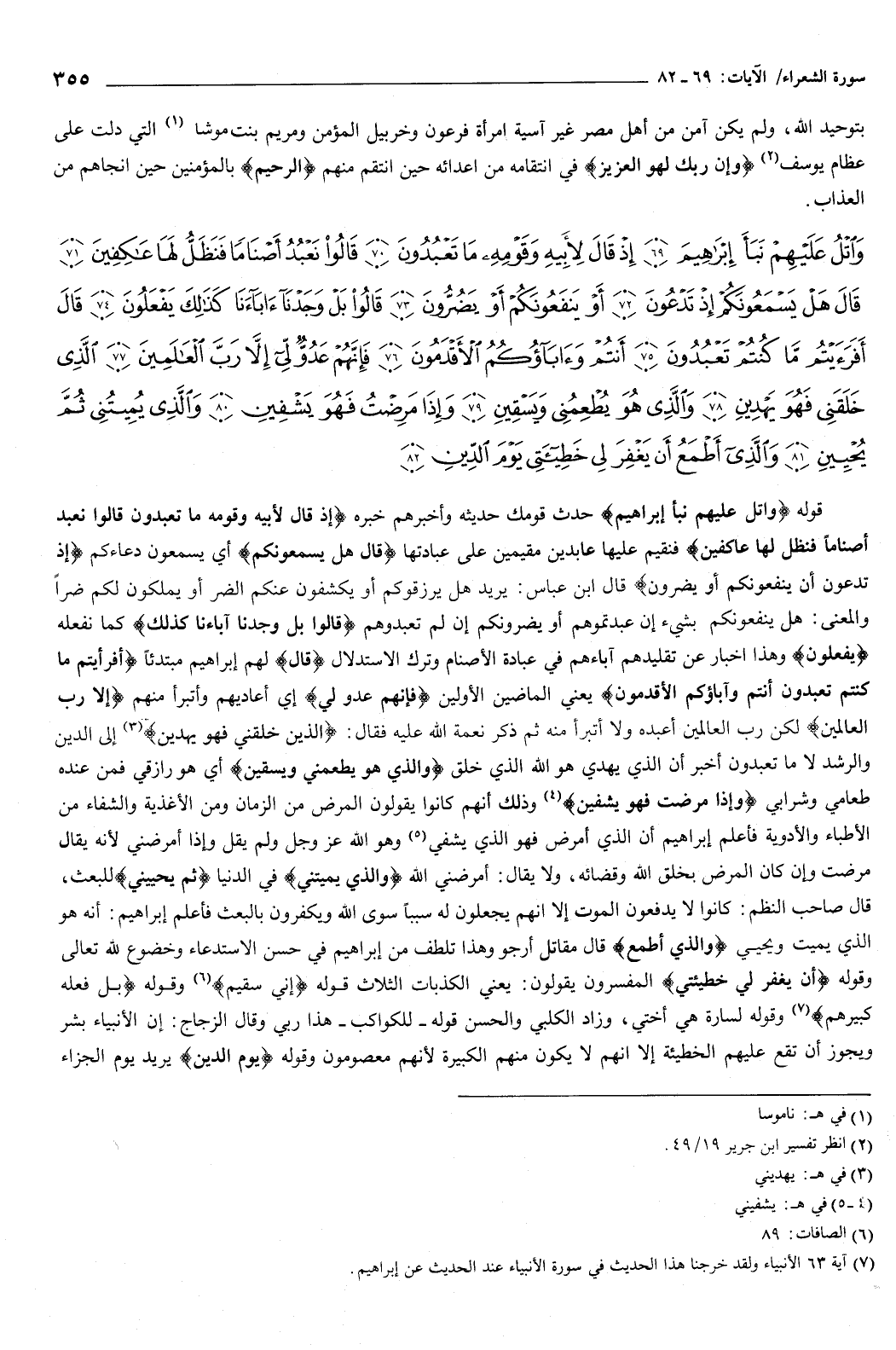 {وَاتْلُ عَلَيْهِمْ نَبَأَ إِبْرَاهِيمَ {69} إِذْ قَالَ لأَبِيهِ وَقَوْمِهِ مَا تَعْبُدُونَ {70} قَالُوا نَعْبُدُ أَصْنَامًا فَنَظَلُّ لَهَا عَاكِفِينَ {71} قَالَ هَلْ يَسْمَعُونَكُمْ إِذْ تَدْعُونَ {72} أَوْ يَنْفَعُونَكُمْ أَوْ يَضُرُّونَ {73} قَالُوا بَلْ وَجَدْنَا آبَاءَنَا كَذَلِكَ يَفْعَلُونَ {74} قَالَ أَفَرَأَيْتُمْ مَا كُنْتُمْ تَعْبُدُونَ {75} أَنْتُمْ وَآبَاؤُكُمُ الأَقْدَمُونَ {76} فَإِنَّهُمْ عَدُوٌّ لِي إِلا رَبَّ الْعَالَمِينَ {77} الَّذِي خَلَقَنِي فَهُوَ يَهْدِينِ {78} وَالَّذِي هُوَ يُطْعِمُنِي وَيَسْقِينِ {79} وَإِذَا مَرِضْتُ فَهُوَ يَشْفِينِ {80} وَالَّذِي يُمِيتُنِي ثُمَّ يُحْيِينِ {81} وَالَّذِي أَطْمَعُ أَنْ يَغْفِرَ لِي خَطِيئَتِي يَوْمَ الدِّينِ {82} } [الشعراء: 69-82] قوله: {وَاتْلُ عَلَيْهِمْ نَبَأَ إِبْرَاهِيمَ} [الشعراء: 69] حدث قومك حديثه وأخبرهم خبره.