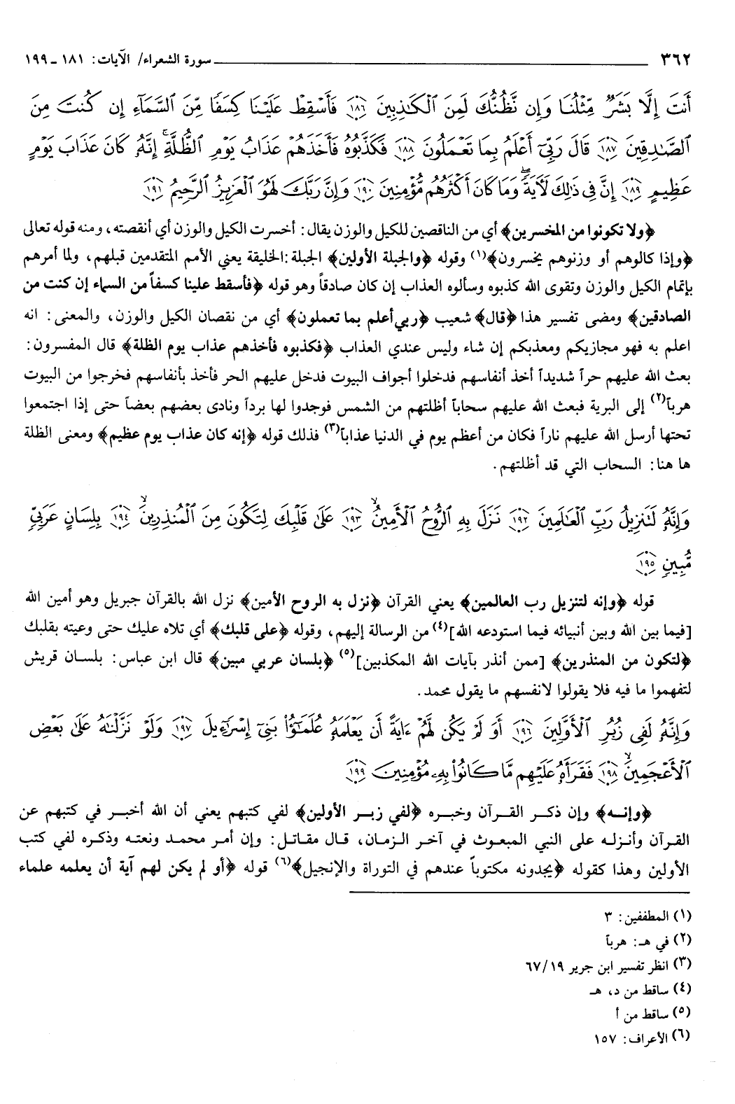أَنْتَ إِلا بَشَرٌ مِثْلُنَا وَإِنْ نَظُنُّكَ لَمِنَ الْكَاذِبِينَ {186} فَأَسْقِطْ عَلَيْنَا كِسَفًا مِنَ السَّمَاءِ إِنْ كُنْتَ مِنَ الصَّادِقِينَ {187} قَالَ رَبِّي أَعْلَمُ بِمَا تَعْمَلُونَ {188} فَكَذَّبُوهُ فَأَخَذَهُمْ عَذَابُ يَوْمِ الظُّلَّةِ إِنَّهُ كَانَ عَذَابَ يَوْمٍ عَظِيمٍ {189} إِنَّ فِي ذَلِكَ لآيَةً وَمَا كَانَ أَكْثَرُهُمْ مُؤْمِنِينَ {190} وَإِنَّ رَبَّكَ لَهُوَ الْعَزِيزُ الرَّحِيمُ {191} } [الشعراء: 181-191] {وَلا تَكُونُوا مِنَ الْمُخْسِرِينَ} [الشعراء: 181] أي: من الناقصين للكيل والوزن، يقال: أخسرت الكيل والوزن، أي أنقصته، ومنه قوله تعالى: {وَإِذَا كَالُوهُمْ أَوْ وَزَنُوهُمْ يُخْسِرُونَ} [المطففين: 3] .