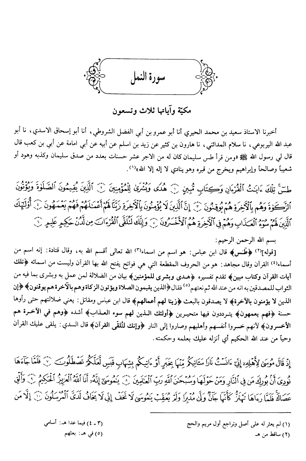 {طس تِلْكَ آيَاتُ الْقُرْءَانِ وَكِتَابٍ مُبِينٍ {1} هُدًى وَبُشْرَى لِلْمُؤْمِنِينَ {2} الَّذِينَ يُقِيمُونَ الصَّلاةَ وَيُؤْتُونَ الزَّكَاةَ وَهُمْ بِالآخِرَةِ هُمْ يُوقِنُونَ {3} إِنَّ الَّذِينَ لا يُؤْمِنُونَ بِالآخِرَةِ زَيَّنَّا لَهُمْ أَعْمَالَهُمْ فَهُمْ يَعْمَهُونَ {4} أُولَئِكَ الَّذِينَ لَهُمْ سُوءُ الْعَذَابِ وَهُمْ فِي الآخِرَةِ هُمُ الأَخْسَرُونَ {5} وَإِنَّكَ لَتُلَقَّى الْقُرْءَانَ مِنْ لَدُنْ حَكِيمٍ عَلِيمٍ {6} } [النمل: 1-6] بسم الله الرحمن الرحيم قوله: {طس} [النمل: 1] قال ابن عباس: هو اسم من أسماء الله تعالى، أقسم الله به.