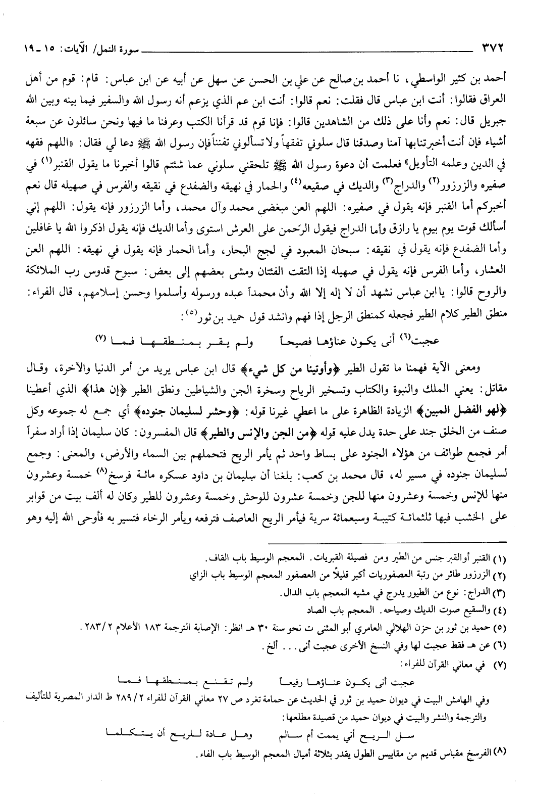 أَحْمَدُ بْنُ كَثِيرٍ الْوَاسِطِيُّ، نا أَحْمَدُ بْنُ صَالِحٍ، عَنْ عَلِيِّ بْنِ الْحَسَنِ، عَنْ سَهْلٍ، عَنْ أَبِيهِ، عَنِ ابْنِ عَبَّاسٍ: قَامَ قَوْمٌ مِنْ أَهْلِ الْعِرَاقِ، فَقَالُوا: أَنْتَ ابْنُ عَبَّاسٍ؟ قَالَ: فَقُلْتُ: نَعَمْ، قَالُوا: أَنْتَ ابْنُ عَمِّ الَّذِي يَزْعُمُ أَنَّهُ رَسُولُ اللَّهِ، وَالسَّفِيرُ فِيمَا بَيْنَهُ وَبَيْنَ اللَّهِ جِبْرِيلُ؟ قَالَ: نَعَمْ، وَأَنَا عَلَى ذَلِكَ مِنَ الشَّاهِدِينَ، قَالُوا: فَإِنَّا قَوْمٌ قَدْ قَرَأْنَا الْكُتُبَ وَعَرَفْنَا مَا فِيهَا، وَنَحْنُ سَائِلُونَ عَنْ سَبْعَةِ أَشْيَاءَ، فَإِنْ أَنْتَ أَخْبَرْتَنَا بِهَا آمَنَّا وَصَدَّقْنَا، قَالَ: سَلُونِي تَفَقُّهًا، وَلا تَسْأَلُونِي تَفَنُّنًا، فَإِنَّ رَسُولَ اللَّهِ، صَلَّى اللهُ عَلَيْهِ وَسَلَّمَ، دَعَا لِي فَقَالَ: «اللَّهُمَّ فَقِّهْهُ فِي الدِّينِ وَعَلِّمْهُ التَّأْوِيلَ» فَعَلِمْتُ أَنَّ دَعْوَةَ رَسُولِ اللَّهِ، صَلَّى اللهُ عَلَيْهِ وَسَلَّمَ، تَلْحَقُنِي، سَلُونِي عَمَّا شِئْتُمْ، قَالُوا: أَخْبِرْنَا مَا يَقُولُ4، وَالزُّرْزُورِ، وَالدُّرَّاجُ، وَالدِّيكُ فِي صَقِيعِهِ، وَالْحِمَارُ فِي نَهِيقِهِ، وَالضِّفْدِعُ فِي نَقِيقِهِ، وَالْفَرَسُ فِي صَهِيلِهِ، قَالَ: نَعَمْ، أُخْبِرُكُمْ؛ أَمَّا الْقُنْبُرُ فَإِنَّهُ يَقُولُ فِي صَفِيرِهِ: اللَّهُمَّ الْعَنْ مُبْغِضِي مُحَمَّدٍ وَآلِ مُحَمَّدٍ، وَأَمَّا الزُّرْزُورُ فَإِنَّهُ يَقُولُ: اللَّهُمَّ إِنِّي أَسْأَلُكَ قُوتَ يَوْمٍ بِيَوْمٍ يَا رَازِقُ، وَأَمَّا الدُّرَّاجُ فَيَقُولُ: الرَّحْمَنُ عَلَى الْعَرْشِ اسْتَوَى، وَأَمَّا الدِّيكُ فَإِنَّهُ يَقُولُ: اذْكُرُوا اللَّهَ يَا غَافِلِينَ، وَأَمَّا الضِّفْدِعُ فَإِنَّهُ يَقُولُ فِي نَقِيقِهِ: سُبْحَانَ الْمَعْبُودِ فِي لُجَجِ الْبِحَارِ، وَأَمَّا الْحِمَارُ فَإِنَّهُ يَقُولُ فِي نَهِيقِهِ: اللَّهُمَّ الْعَنِ الْعَشَّارَ، وَأَمَّا الْفَرَسُ فَإِنَّهُ يَقُولُ فِي صَهِيلِهِ إِذَا الْتَقَتِ الْفِئَتَانِ وَمَشَى بَعْضُهُمْ إِلَى بَعْضٍ: سُبُّوحٌ قُدُّوسٌ رَبُّ الْمَلائِكَةِ وَالرُّوحِ، قَالُوا: يَابْنَ عَبَّاسٍ، نَشْهَدُ أَنْ لا إِلَهَ إِلا اللَّهُ، وَأَنَّ مُحَمَّدًا عَبْدُهُ وَرَسُولُهُ، وَأَسْلَمُوا وَحَسُنَ إِسْلامُهُمْ، قَالَ الْفَرَّاءُ: مَنْطِقُ الطَّيْرِ كَلامُ الطَّيْرِ، فَجَعَلَهُ كَمَنْطِقِ الرَّجُلِ إِذَا فَهِمَ