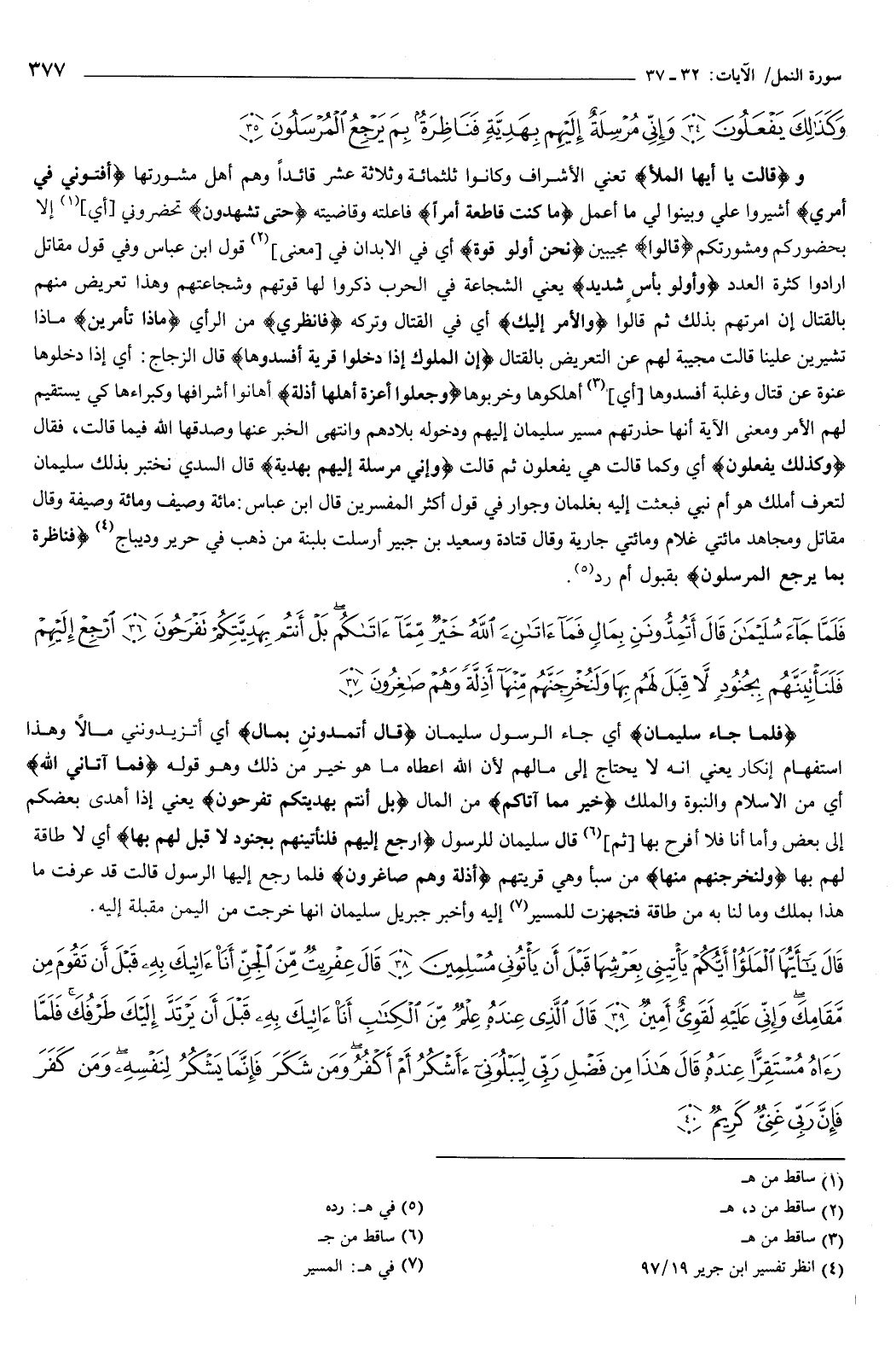 وَكَذَلِكَ يَفْعَلُونَ {34} وَإِنِّي مُرْسِلَةٌ إِلَيْهِمْ بِهَدِيَّةٍ فَنَاظِرَةٌ بِمَ يَرْجِعُ الْمُرْسَلُونَ {35} } [النمل: 32-35] و {قَالَتْ يَأَيُّهَا الْمَلأُ} [النمل: 32] تعني: الأشراف، وكانوا ثلاث مائة عشر قائدا، وهم أهل مشورتها، {أَفْتُونِي فِي أَمْرِي} [النمل: 32] أشيروا عليّ وبينوا لي ما أعمل، {مَا كُنْتُ قَاطِعَةً أَمْرًا} [النمل: 32] فاعلته وقاضيته، حتى تشهدون تحضروني، أي: إلا بحضوركم ومشورتكم.