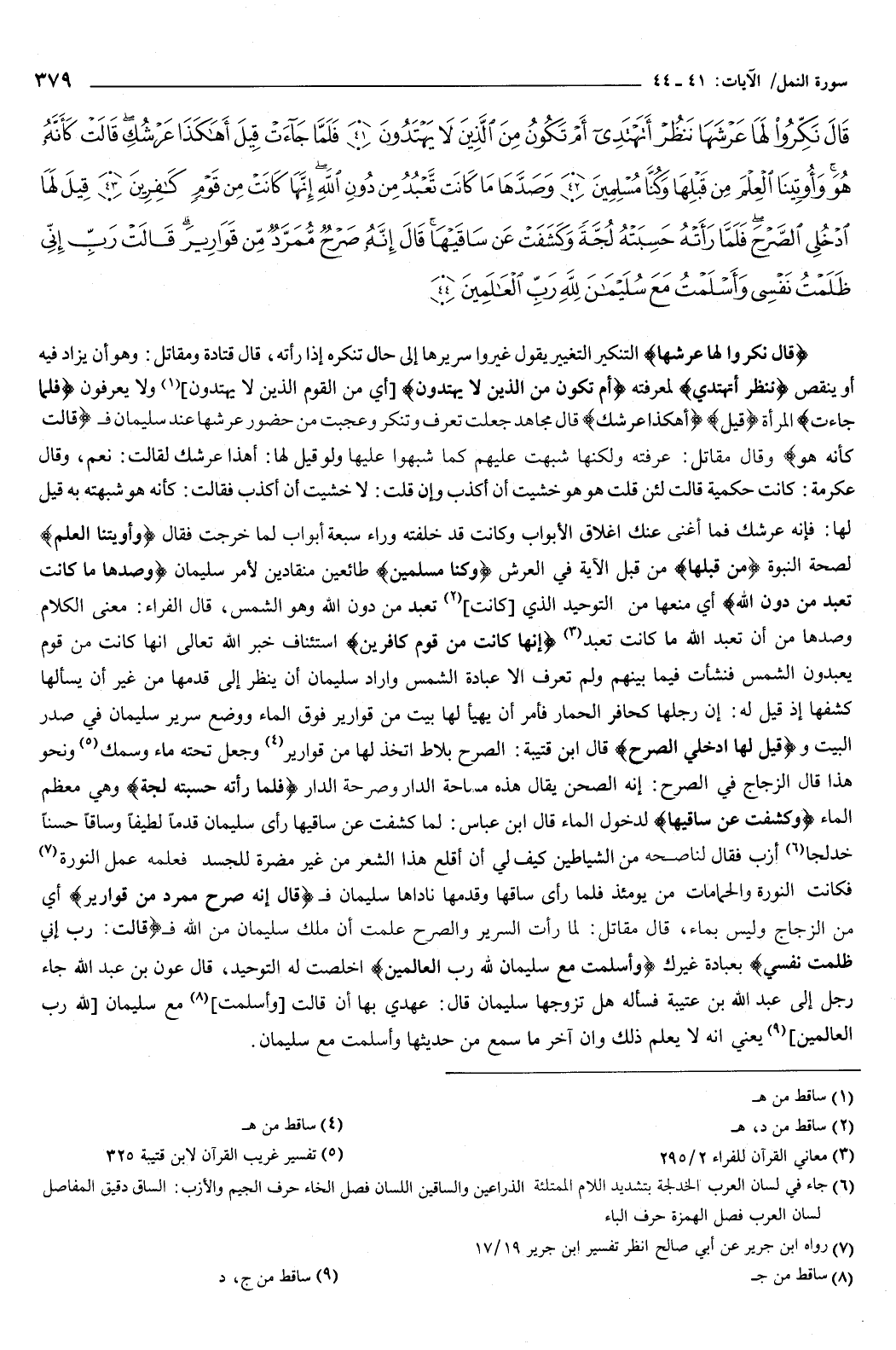 قَالَ نَكِّرُوا لَهَا عَرْشَهَا نَنْظُرْ أَتَهْتَدِي أَمْ تَكُونُ مِنَ الَّذِينَ لا يَهْتَدُونَ {41} فَلَمَّا جَاءَتْ قِيلَ أَهَكَذَا عَرْشُكِ قَالَتْ كَأَنَّهُ هُوَ وَأُوتِينَا الْعِلْمَ مِنْ قَبْلِهَا وَكُنَّا مُسْلِمِينَ {42} وَصَدَّهَا مَا كَانَتْ تَعْبُدُ مِنْ دُونِ اللَّهِ إِنَّهَا كَانَتْ مِنْ قَوْمٍ كَافِرِينَ {43} قِيلَ لَهَا ادْخُلِي الصَّرْحَ فَلَمَّا رَأَتْهُ حَسِبَتْهُ لُجَّةً وَكَشَفَتْ عَنْ سَاقَيْهَا قَالَ إِنَّهُ صَرْحٌ مُمَرَّدٌ مِنْ قَوَارِيرَ قَالَتْ رَبِّ إِنِّي ظَلَمْتُ نَفْسِي وَأَسْلَمْتُ مَعَ سُلَيْمَانَ لِلَّهِ رَبِّ الْعَالَمِينَ {44} } [النمل: 41-44] {قَالَ نَكِّرُوا لَهَا عَرْشَهَا} [النمل: 41] التنكير التغيير، يقول: غيروا سريرها إلى حال تنكره إذا رأته.