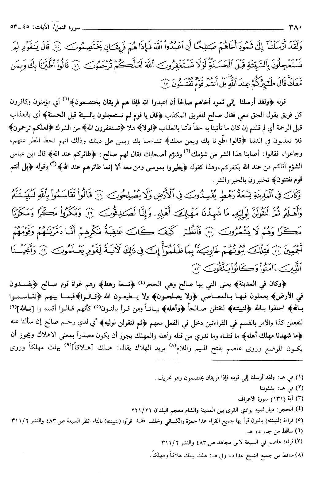 {وَكَانَ فِي الْمَدِينَةِ تِسْعَةُ رَهْطٍ يُفْسِدُونَ فِي الأَرْضِ وَلا يُصْلِحُونَ {48} قَالُوا تَقَاسَمُوا بِاللَّهِ لَنُبَيِّتَنَّهُ وَأَهْلَهُ ثُمَّ لَنَقُولَنَّ لِوَلِيِّهِ مَا شَهِدْنَا مَهْلِكَ أَهْلِهِ وَإِنَّا لَصَادِقُونَ {49} وَمَكَرُوا مَكْرًا وَمَكَرْنَا مَكْرًا وَهُمْ لا يَشْعُرُونَ {50} فَانْظُرْ كَيْفَ كَانَ عَاقِبَةُ مَكْرِهِمْ أَنَّا دَمَّرْنَاهُمْ وَقَوْمَهُمْ أَجْمَعِينَ {51} فَتِلْكَ بُيُوتُهُمْ خَاوِيَةً بِمَا ظَلَمُوا إِنَّ فِي ذَلِكَ لآيَةً لِقَوْمٍ يَعْلَمُونَ {52} وَأَنْجَيْنَا الَّذِينَ آمَنُوا وَكَانُوا يَتَّقُونَ {53} } [النمل: 48-53] {وَكَانَ فِي الْمَدِينَةِ} [النمل: 48] يعني: التي بها صالح، وهي الحجر، تسعة رهط وهم غواة قوم صالح، {يُفْسِدُونَ فِي الأَرْضِ} [النمل: 48] يعملون فيها بالمعاصي، ولا يصلحون ولا يطيعون الله.