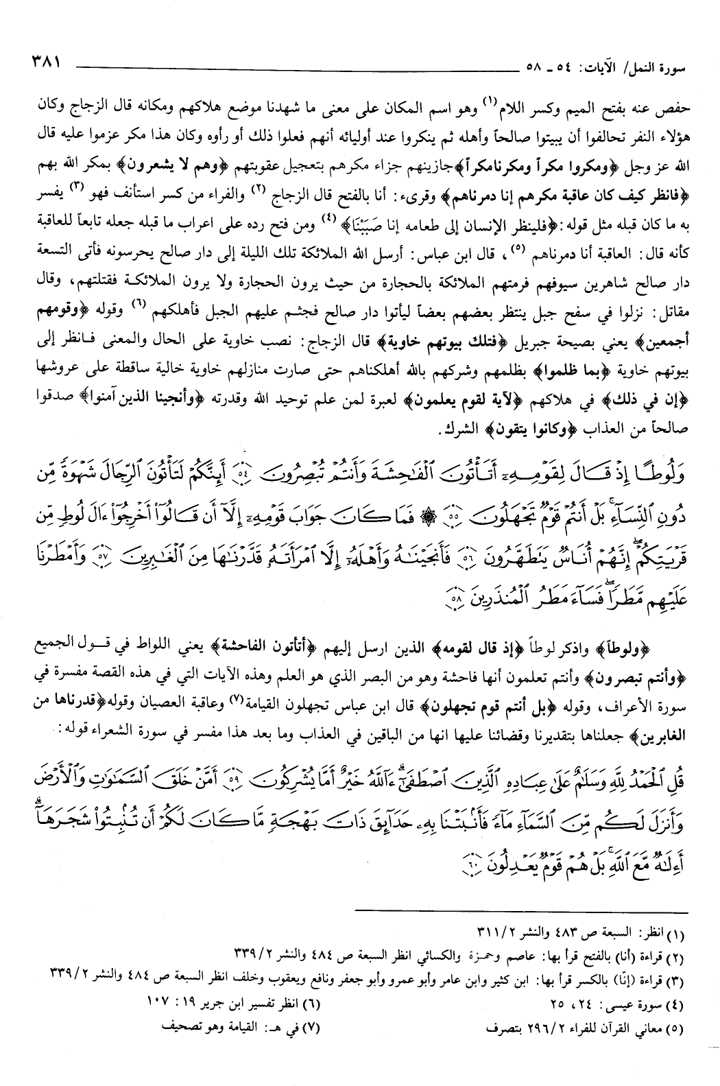 {وَلُوطًا إِذْ قَالَ لِقَوْمِهِ أَتَأْتُونَ الْفَاحِشَةَ وَأَنْتُمْ تُبْصِرُونَ {54} أَئِنَّكُمْ لَتَأْتُونَ الرِّجَالَ شَهْوَةً مِنْ دُونِ النِّسَاءِ بَلْ أَنْتُمْ قَوْمٌ تَجْهَلُونَ {55} فَمَا كَانَ جَوَابَ قَوْمِهِ إِلا أَنْ قَالُوا أَخْرِجُوا آلَ لُوطٍ مِنْ قَرْيَتِكُمْ إِنَّهُمْ أُنَاسٌ يَتَطَهَّرُونَ {56} فَأَنْجَيْنَاهُ وَأَهْلَهُ إِلا امْرَأَتَهُ قَدَّرْنَاهَا مِنَ الْغَابِرِينَ {57} وَأَمْطَرْنَا عَلَيْهِمْ مَطَرًا فَسَاءَ مَطَرُ الْمُنذَرِينَ {58} } [النمل: 54-58] ولوطا واذكر لوطا، {إِذْ قَالَ لِقَوْمِهِ} [النمل: 54] الذين أرسل إليهم أتأتون الفاحشة يعني: اللواط في قول الجميع، وأنتم تبصرون وأنتم تعلمون أنها فاحشة، وهو من البصر الذي هو العلم، وهذه الآيات التي في هذه القصة مفسرة في { [الأعراف.