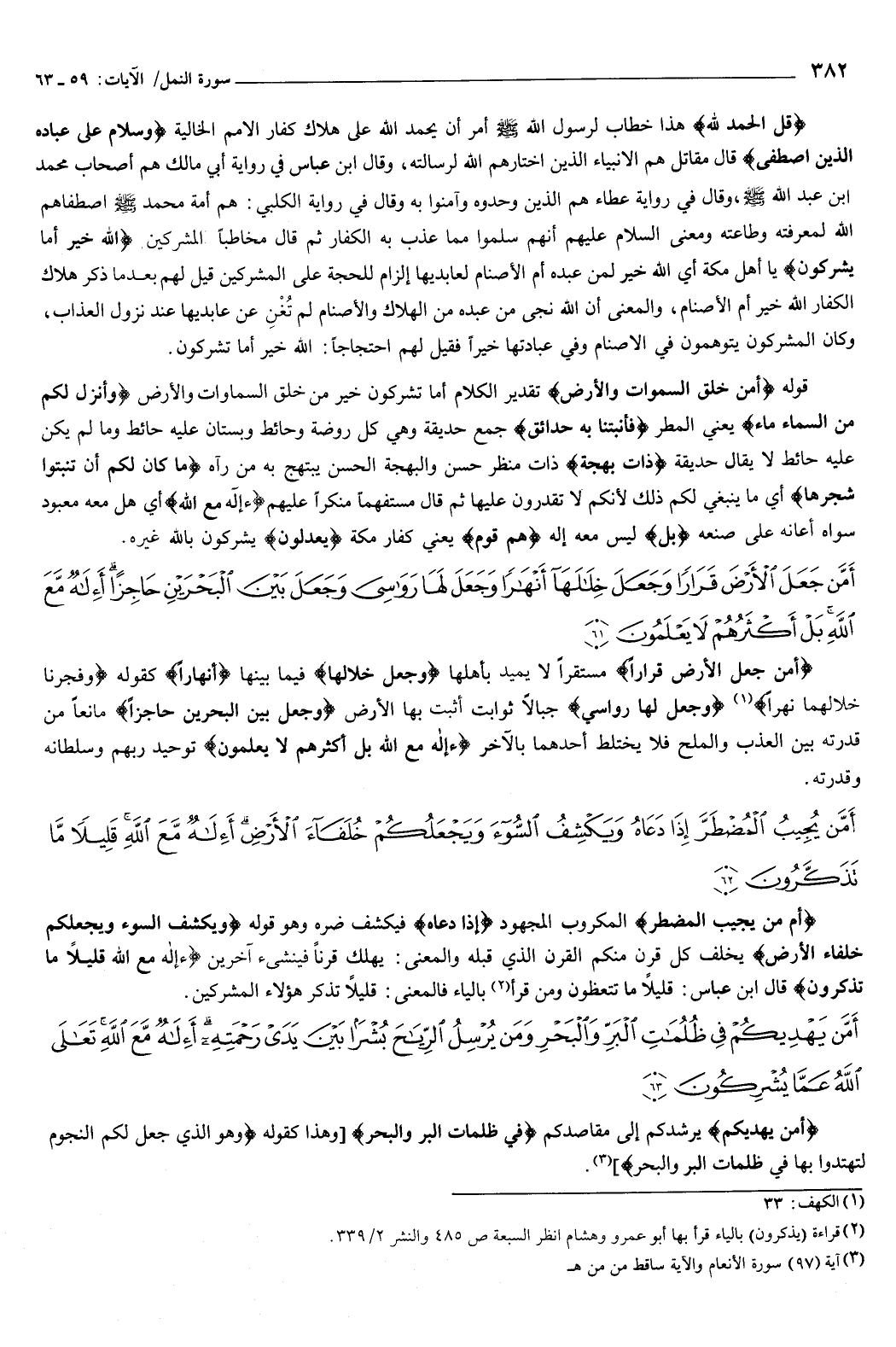 {أَمَّنْ يُجِيبُ الْمُضْطَرَّ إِذَا دَعَاهُ وَيَكْشِفُ السُّوءَ وَيَجْعَلُكُمْ خُلَفَاءَ الأَرْضِ أَإِلَهٌ مَعَ اللَّهِ قَلِيلا مَا تَذَكَّرُونَ} [النمل: 62] {أَمَّنْ يُجِيبُ الْمُضْطَرَّ} [النمل: 62] المكروب المجهود، إذا دعاه فيكشف ضره، وهو قوله: {وَيَكْشِفُ السُّوءَ وَيَجْعَلُكُمْ خُلَفَاءَ الأَرْضِ} [النمل: 62] يخلف كل قرن منكم القرن الذي قبله، والمعنى: يهلك قرنا فينشئ آخرين.