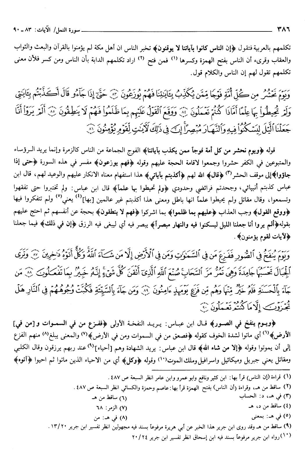 {وَيَوْمَ يُنْفَخُ فِي الصُّورِ فَفَزِعَ مَنْ فِي السَّمَوَاتِ وَمَنْ فِي الأَرْضِ إِلا مَنْ شَاءَ اللَّهُ وَكُلٌّ أَتَوْهُ دَاخِرِينَ {87} وَتَرَى الْجِبَالَ تَحْسَبُهَا جَامِدَةً وَهِيَ تَمُرُّ مَرَّ السَّحَابِ صُنْعَ اللَّهِ الَّذِي أَتْقَنَ كُلَّ شَيْءٍ إِنَّهُ خَبِيرٌ بِمَا تَفْعَلُونَ {88} مَنْ جَاءَ بِالْحَسَنَةِ فَلَهُ خَيْرٌ مِنْهَا وَهُمْ مِنْ فَزَعٍ يَوْمَئِذٍ آمِنُونَ {89} وَمَنْ جَاءَ بِالسَّيِّئَةِ فَكُبَّتْ وُجُوهُهُمْ فِي النَّارِ هَلْ تُجْزَوْنَ إِلا مَا كُنْتُمْ تَعْمَلُونَ {90} } [النمل: 87-90] {وَيَوْمَ يُنْفَخُ فِي الصُّورِ} [النمل: 87] قال ابن عباس: يريد النفخة الأولى.