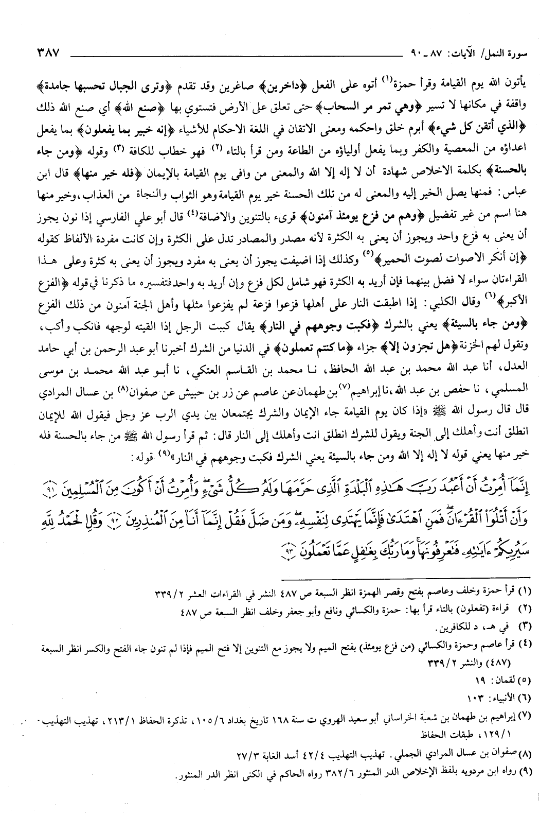 والمعنى: له من تلك الحسنة خير يوم القيامة، وهو الثواب والنجاة من العذاب، وخير منها هنا اسم من غير تفضيل، {وَهُمْ مِنْ فَزَعٍ يَوْمَئِذٍ آمِنُونَ} [النمل: 89] قرئ بالتنوين والإضافة، قال أبو علي الفارسي: إذا نون يجوز أن يعني به فزع واحد، ويجوز أن يعني به الكثرة، لأنه مصدر، والمصادر تدل على الكثرة، وإن كانت مفردة الألفاظ كقوله: {إِنَّ أَنْكَرَ الأَصْوَاتِ لَصَوْتُ الْحَمِيرِ} [لقمان: 19] وكذلك إذا أضيفت يجوز أن يعني به مفرد، ويجوز أن يعني به كثرة.