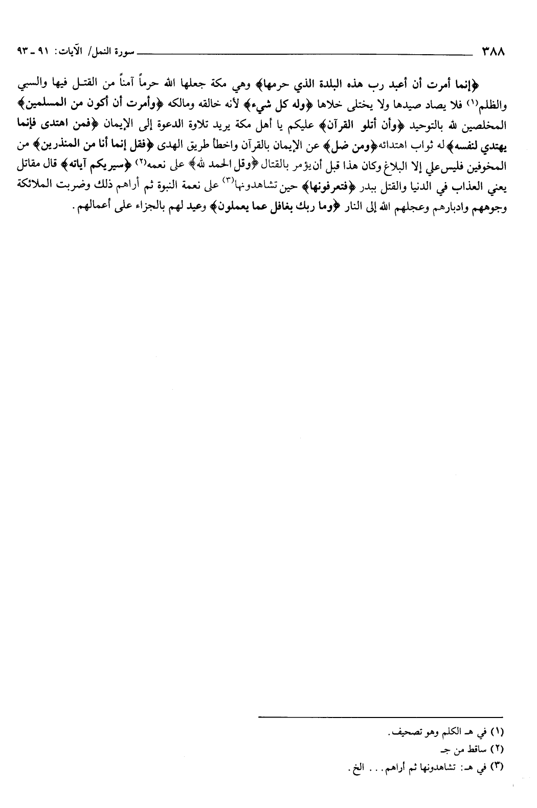 إِنَّمَا أُمِرْتُ أَنْ أَعْبُدَ رَبَّ هَذِهِ الْبَلْدَةِ الَّذِي حَرَّمَهَا} [النمل: 91] وهي مكة، جعلها الله حرما آمنا من القتل فيها والسبي والظلم، فلا يصاد صيدها، ولا يختلى خلاها، {وَلَهُ كُلُّ شَيْءٍ} [النمل: 91] لأنه خالقه ومالكه، {وَأُمِرْتُ أَنْ أَكُونَ مِنَ الْمُسْلِمِينَ} [النمل: 91] المخلصين لله بالتوحيد.