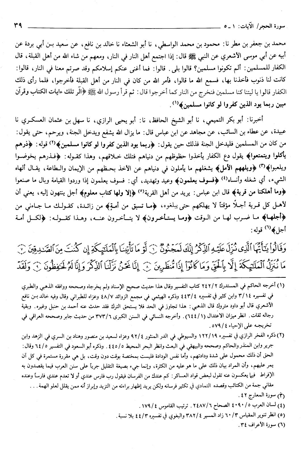 505 - أَخْبَرَنَا أَبُو بَكْرٍ التَّمِيمِيُّ، نا أَبُو الشَّيْخِ الْحَافِظُ، نا أَبُو يَحْيَى الرَّازِيُّ، نا سَهْلُ بْنُ عُثْمَانَ الْعَسْكَرِيُّ، نا عَبِيدَةُ، عَنْ عَطَاءِ بْنِ السَّائِبِ، عَنْ مُجَاهِدٍ، عَنِ ابْنِ عَبَّاسٍ، قَالَ: مَا يَزَالُ اللَّهُ يَشْفَعُ وَيُدْخِلُ الْجَنَّةَ، وَيَرْحَمُ، حَتَّى يَقُولَ: مَنْ كَانَ مِنَ الْمُسْلِمِينَ فَلْيَدْخُلِ الْجَنَّةَ، فَذَلِكَ حِينَ يَقُولُ: {رُبَمَا يَوَدُّ الَّذِينَ كَفَرُوا لَوْ كَانُوا مُسْلِمِينَ} [الحجر: 2] .