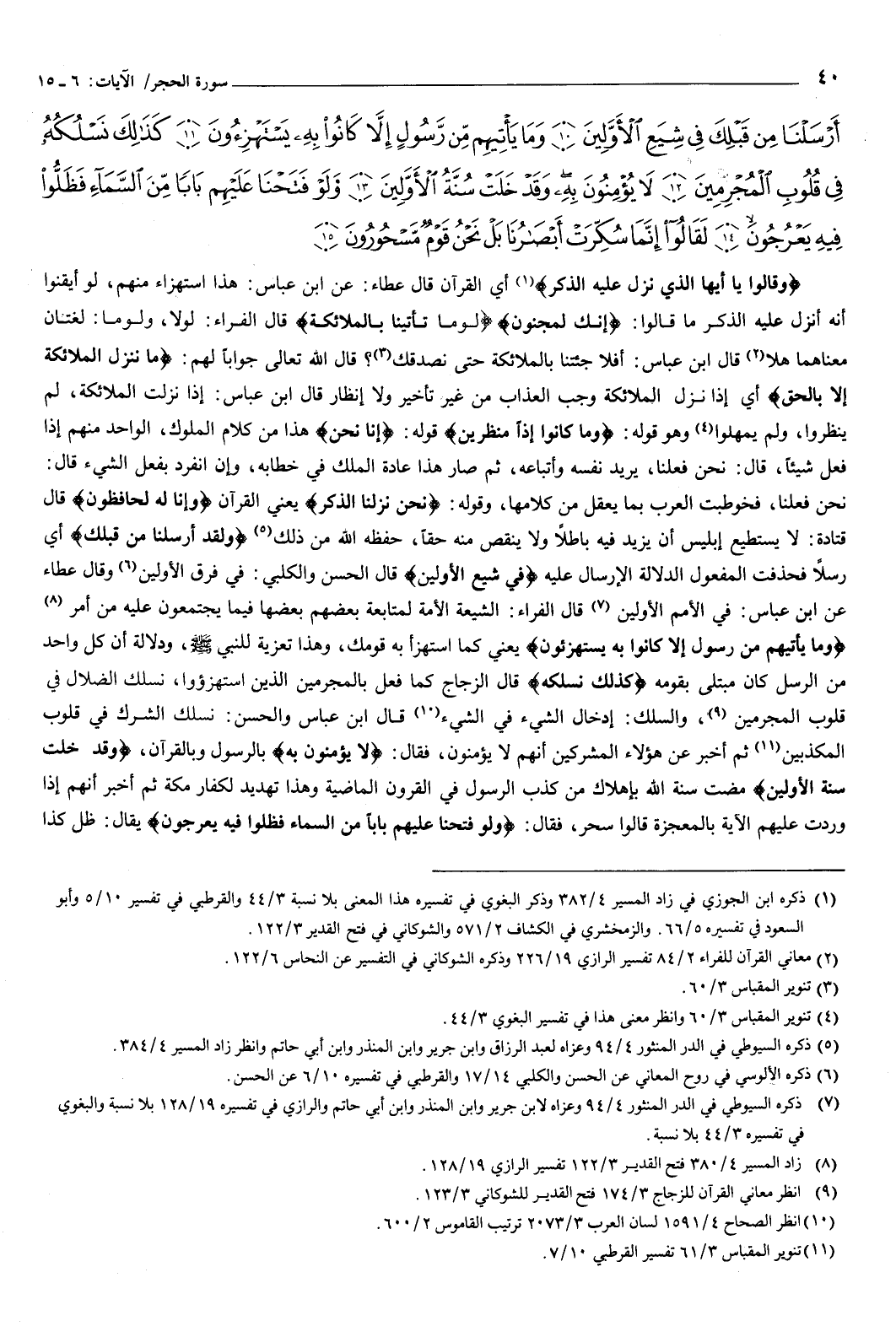 أَرْسَلْنَا مِنْ قَبْلِكَ فِي شِيَعِ الأَوَّلِينَ {10} وَمَا يَأْتِيهِمْ مِنْ رَسُولٍ إِلا كَانُوا بِهِ يَسْتَهْزِئُونَ {11} كَذَلِكَ نَسْلُكُهُ فِي قُلُوبِ الْمُجْرِمِينَ {12} لا يُؤْمِنُونَ بِهِ وَقَدْ خَلَتْ سُنَّةُ الأَوَّلِينَ {13} وَلَوْ فَتَحْنَا عَلَيْهِمْ بَابًا مِنَ السَّمَاءِ فَظَلُّوا فِيهِ يَعْرُجُونَ {14} لَقَالُوا إِنَّمَا سُكِّرَتْ أَبْصَارُنَا بَلْ نَحْنُ قَوْمٌ مَسْحُورُونَ {15} } [الحجر: 6-15] {وَقَالُوا يَأَيُّهَا الَّذِي نُزِّلَ عَلَيْهِ الذِّكْرُ} [الحجر: 6] أي القرآن، قال عطاء، عن ابن عباس: هذا استهزاء منهم، لو أيقنوا أنه أنزل عليه الذكر ما قالوا: إنك لمجنون.
