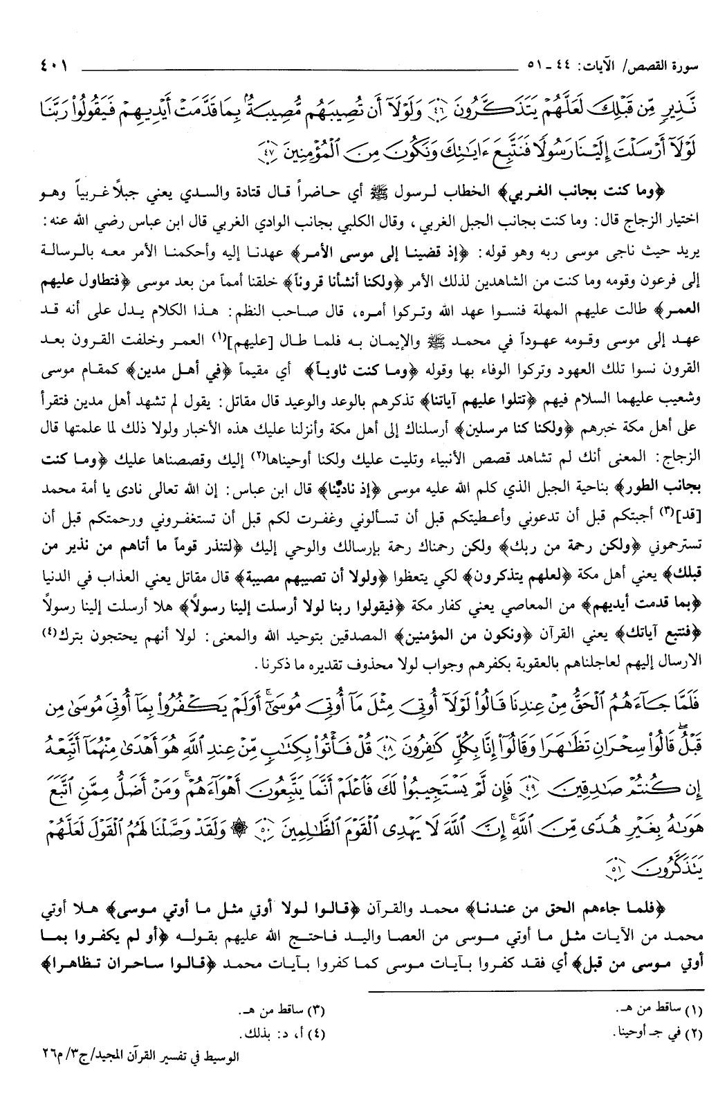نَذِيرٍ مِنْ قَبْلِكَ لَعَلَّهُمْ يَتَذَكَّرُونَ {46} وَلَوْلا أَنْ تُصِيبَهُمْ مُصِيبَةٌ بِمَا قَدَّمَتْ أَيْدِيهِمْ فَيَقُولُوا رَبَّنَا لَوْلا أَرْسَلْتَ إِلَيْنَا رَسُولا فَنَتَّبِعَ آيَاتِكَ وَنَكُونَ مِنَ الْمُؤْمِنِينَ {47} } [القصص: 44-47] {وَمَا كُنْتَ بِجَانِبِ الْغَرْبِيِّ} [القصص: 44] الخطاب لرسول الله صَلَّى اللهُ عَلَيْهِ وَسَلَّمَ، أي حاضرا.