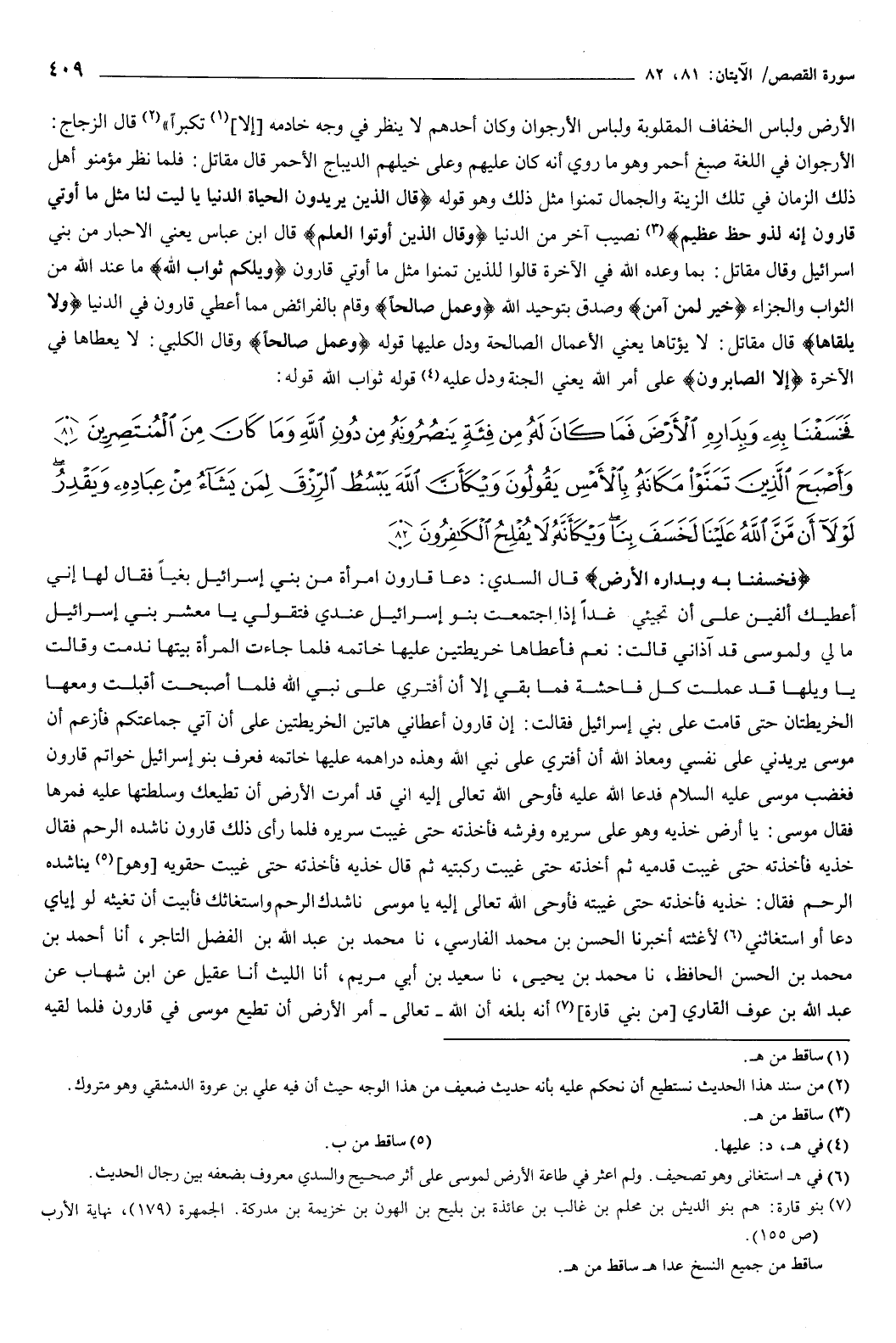 قوله: {فَخَسَفْنَا بِهِ وَبِدَارِهِ الأَرْضَ فَمَا كَانَ لَهُ مِنْ فِئَةٍ يَنْصُرُونَهُ مِنْ دُونِ اللَّهِ وَمَا كَانَ مِنَ الْمُنْتَصِرِينَ {81} وَأَصْبَحَ الَّذِينَ تَمَنَّوْا مَكَانَهُ بِالأَمْسِ يَقُولُونَ وَيْكَأَنَّ اللَّهَ يَبْسُطُ الرِّزْقَ لِمَنْ يَشَاءُ مِنْ عِبَادِهِ وَيَقْدِرُ لَوْلا أَنْ مَنَّ اللَّهُ عَلَيْنَا لَخَسَفَ بِنَا وَيْكَأَنَّهُ لا يُفْلِحُ الْكَافِرُونَ {82} } [القصص: 81-82] {فَخَسَفْنَا بِهِ وَبِدَارِهِ الأَرْضَ} [القصص: 81] قال السدي: دعا قارون امرأة من بني إسرائيل بغيا، فقال لها: إني أعطيك ألفين على أن تجيئي غدا إذا اجتمعت بنو إسرائيل عندي، فتقولي: يا معشر بني إسرائيل، ما لي ولموسى، قد آذاني.