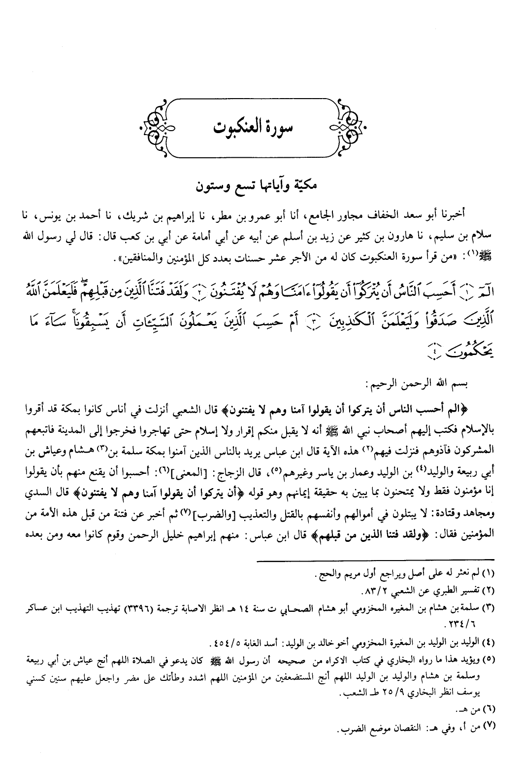 {الم {1} أَحَسِبَ النَّاسُ أَنْ يُتْرَكُوا أَنْ يَقُولُوا آمَنَّا وَهُمْ لا يُفْتَنُونَ {2} وَلَقَدْ فَتَنَّا الَّذِينَ مِنْ قَبْلِهِمْ فَلَيَعْلَمَنَّ اللَّهُ الَّذِينَ صَدَقُوا وَلَيَعْلَمَنَّ الْكَاذِبِينَ {3} أَمْ حَسِبَ الَّذِينَ يَعْمَلُونَ السَّيِّئَاتِ أَنْ يَسْبِقُونَا سَاءَ مَا يَحْكُمُونَ {4} } [العنكبوت: 1-4] بسم الله الرحمن الرحيم {الم {1} أَحَسِبَ النَّاسُ أَنْ يُتْرَكُوا أَنْ يَقُولُوا آمَنَّا وَهُمْ لا يُفْتَنُونَ {2} } [العنكبوت: 1-2] قال الشعبي: أنزلت في أناس كانوا بمكة قد أقروا بالإسلام، فكتب إليهم أصحاب نبي الله صَلَّى اللهُ عَلَيْهِ وَسَلَّمَ أنه لا يقبل منكم إقرار ولا إسلام حتى تهاجروا، فخرجوا إلى المدينة، فاتبعهم المشركون فآذوهم، فنزلت فيهم هذه الآية.
