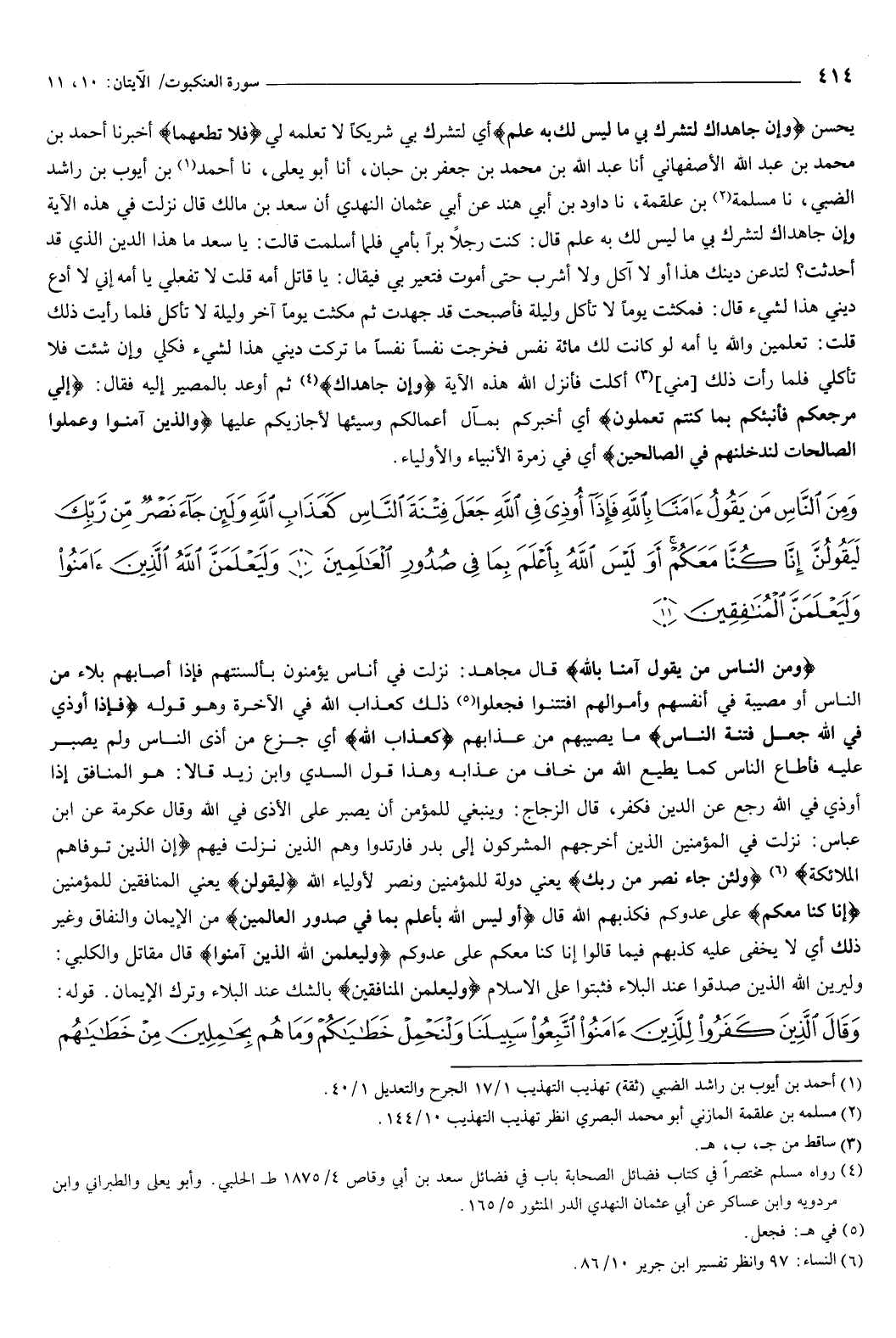 {وَمِنَ النَّاسِ مَنْ يَقُولُ آمَنَّا بِاللَّهِ فَإِذَا أُوذِيَ فِي اللَّهِ جَعَلَ فِتْنَةَ النَّاسِ كَعَذَابِ اللَّهِ وَلَئِنْ جَاءَ نَصْرٌ مِنْ رَبِّكَ لَيَقُولُنَّ إِنَّا كُنَّا مَعَكُمْ أَوَلَيْسَ اللَّهُ بِأَعْلَمَ بِمَا فِي صُدُورِ الْعَالَمِينَ {10} وَلَيَعْلَمَنَّ اللَّهُ الَّذِينَ آمَنُوا وَلَيَعْلَمَنَّ الْمُنَافِقِينَ {11} } [العنكبوت: 10-11] {وَمِنَ النَّاسِ مَنْ يَقُولُ آمَنَّا بِاللَّهِ} [العنكبوت: 10] قال مجاهد: نزلت في أناس يؤمنون بألسنتهم، فإذا أصابهم بلاء من الناس أو مصيبة في أنفسهم وأموالهم افتتنوا، فجعلوا ذلك كعذاب الله في الآخرة.