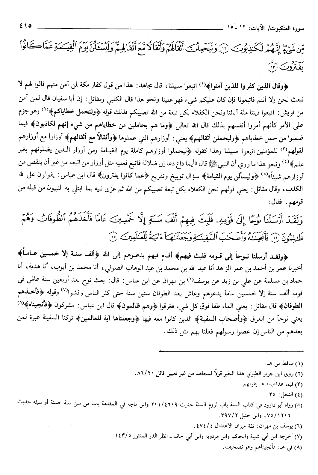 ثم عزى نبيه بما ابتلي به النبيون من قبله من قومهم، فقال: {وَلَقَدْ أَرْسَلْنَا نُوحًا إِلَى قَوْمِهِ فَلَبِثَ فِيهِمْ أَلْفَ سَنَةٍ إِلا خَمْسِينَ عَامًا فَأَخَذَهُمُ الطُّوفَانُ وَهُمْ ظَالِمُونَ {14} فَأَنْجَيْنَاهُ وَأَصْحَابَ السَّفِينَةِ وَجَعَلْنَاهَا آيَةً لِلْعَالَمِينَ {15} } [العنكبوت: 14-15] {وَلَقَدْ أَرْسَلْنَا نُوحًا إِلَى قَوْمِهِ فَلَبِثَ فِيهِمْ} [العنكبوت: 14] أقام فيهم يدعوهم إلى الله، {أَلْفَ سَنَةٍ إِلا خَمْسِينَ عَامًا} [العنكبوت: 14]