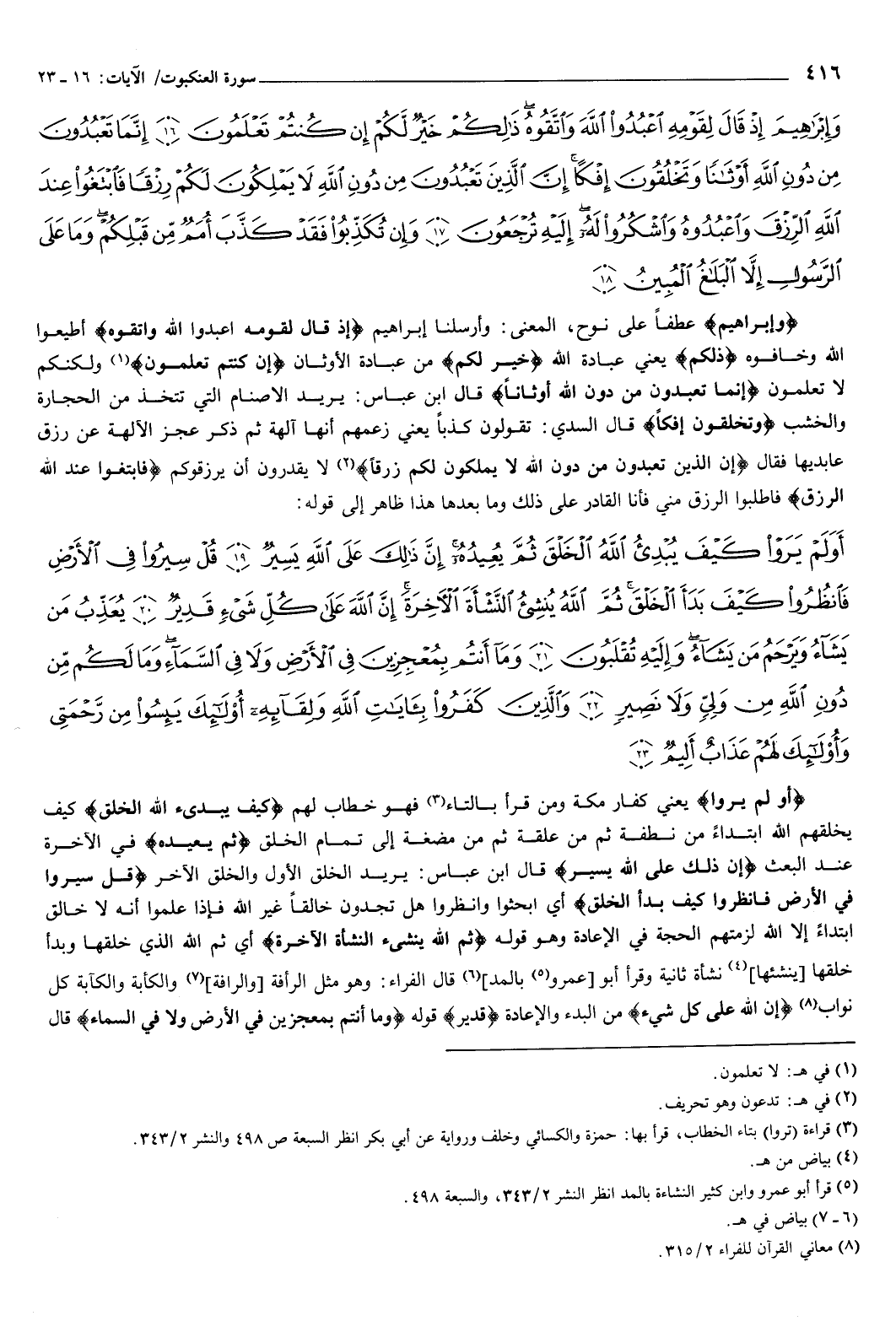 {وَإِبْرَاهِيمَ إِذْ قَالَ لِقَوْمِهِ اعْبُدُوا اللَّهَ وَاتَّقُوهُ ذَلِكُمْ خَيْرٌ لَكُمْ إِنْ كُنْتُمْ تَعْلَمُونَ {16} إِنَّمَا تَعْبُدُونَ مِنْ دُونِ اللَّهِ أَوْثَانًا وَتَخْلُقُونَ إِفْكًا إِنَّ الَّذِينَ تَعْبُدُونَ مِنْ دُونِ اللَّهِ لا يَمْلِكُونَ لَكُمْ رِزْقًا فَابْتَغُوا عِنْدَ اللَّهِ الرِّزْقَ وَاعْبُدُوهُ وَاشْكُرُوا لَهُ إِلَيْهِ تُرْجَعُونَ {17} وَإِنْ تُكَذِّبُوا فَقَدْ كَذَّبَ أُمَمٌ مِنْ قَبْلِكُمْ وَمَا عَلَى الرَّسُولِ إِلا الْبَلاغُ الْمُبِينُ {18} } [العنكبوت: 16-18] وإبراهيم عطفا على نوح، والمعنى: وأرسلنا إبراهيم، {إِذْ قَالَ لِقَوْمِهِ اعْبُدُوا اللَّهَ وَاتَّقُوهُ} [العنكبوت: 16] أطيعوا الله وخافوه، ذلكم يعني: عبادة الله، خير لكم من عبادة الأوثان، {إِنْ كُنْتُمْ تَعْلَمُونَ} [العنكبوت: 16] ولكنكم لا تعلمون.