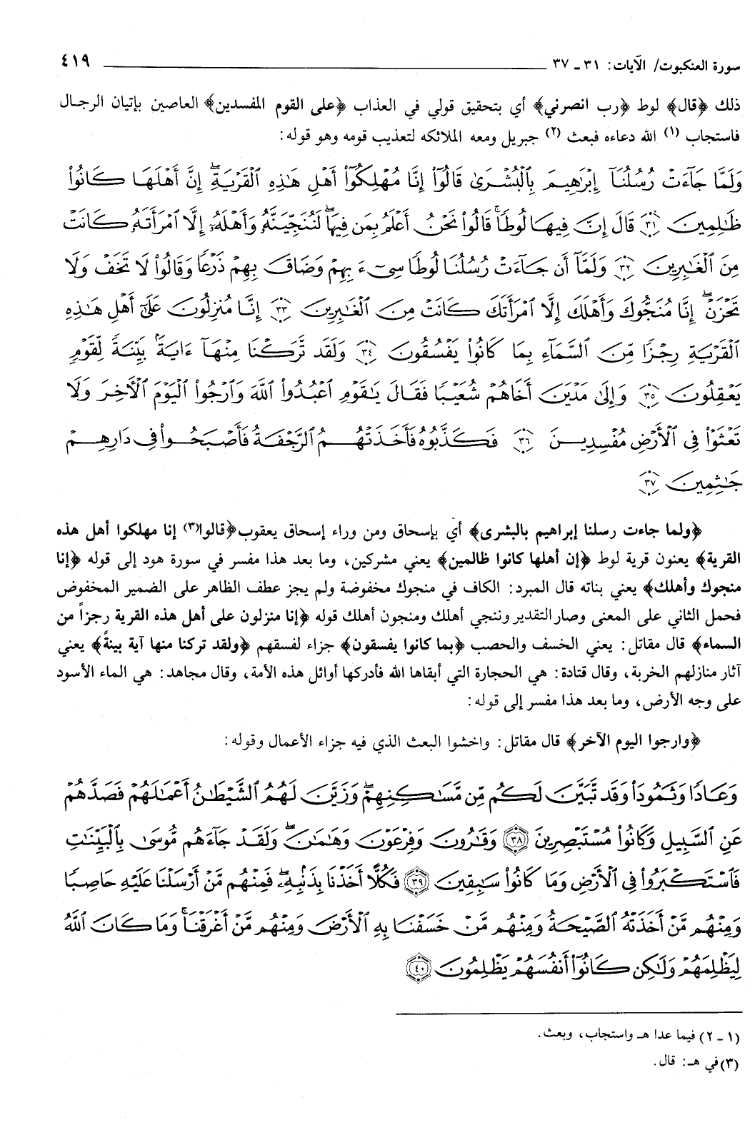 ذلك قال لوط: رب انصرني أي: بتحقيق قولي في العذاب، {عَلَى الْقَوْمِ الْمُفْسِدِينَ} [العنكبوت: 30] العاصين بإتيان الرجال، فاستجاب الله دعاءه، فبعث جبريل ومعه الملائكة لتعذيب قومه، وهو قوله: {وَلَمَّا جَاءَتْ رُسُلُنَا إِبْرَاهِيمَ بِالْبُشْرَى قَالُوا إِنَّا مُهْلِكُو أَهْلِ هَذِهِ الْقَرْيَةِ إِنَّ أَهْلَهَا كَانُوا ظَالِمِينَ {31} قَالَ إِنَّ فِيهَا لُوطًا قَالُوا نَحْنُ أَعْلَمُ بِمَنْ فِيهَا لَنُنَجِّيَنَّهُ وَأَهْلَهُ إِلا امْرَأَتَهُ كَانَتْ مِنَ الْغَابِرِينَ {32} وَلَمَّا أَنْ جَاءَتْ رُسُلُنَا لُوطًا سِيءَ بِهِمْ وَضَاقَ بِهِمْ ذَرْعًا وَقَالُوا لا تَخَفْ وَلا تَحْزَنْ إِنَّا مُنَجُّوكَ وَأَهْلَكَ إِلا امْرَأَتَكَ كَانَتْ مِنَ الْغَابِرِينَ {33} إِنَّا مُنْزِلُونَ عَلَى أَهْلِ هَذِهِ الْقَرْيَةِ رِجْزًا مِنَ السَّمَاءِ بِمَا كَانُوا يَفْسُقُونَ {34} وَلَقَدْ تَرَكْنَا مِنْهَا آيَةً بَيِّنَةً لِقَوْمٍ يَعْقِلُونَ {35} وَإِلَى مَدْيَنَ أَخَاهُمْ شُعَيْبًا فَقَالَ يَا قَوْمِ اعْبُدُوا اللَّهَ وَارْجُوا الْيَوْمَ الآخِرَ وَلا تَعْثَوْا فِي الأَرْضِ مُفْسِدِينَ {36} فَكَذَّبُوهُ فَأَخَذَتْهُمُ الرَّجْفَةُ فَأَصْبَحُوا فِي دَارِهِمْ جَاثِمِينَ {37} } [العنكبوت: 31-37] {وَلَمَّا جَاءَتْ رُسُلُنَا إِبْرَاهِيمَ بِالْبُشْرَى} [العنكبوت: 31] أي: بإسحاق ومن وراء إسحاق يعقوب، {قَالُوا إِنَّا مُهْلِكُو أَهْلِ هَذِهِ الْقَرْيَةِ} [العنكبوت: 31] يعنون: قرية لوط، {إِنَّ أَهْلَهَا كَانُوا ظَالِمِينَ} [العنكبوت: 31] يعني مشركين، وما بعد هذا مفسر في { [هود إلى قوله:] إِنَّا مُنَجُّوكَ وَأَهْلَكَ} [سورة العنكبوت: 33] يعني بناته، قال المبرد: الكاف في منجوك مخفوضة، ولم يجز عطف الظاهر على الضمير المخفوض، فحمل الثاني على المعنى، وصار التقدير وننجي أهلك، ومنجون أهلك.