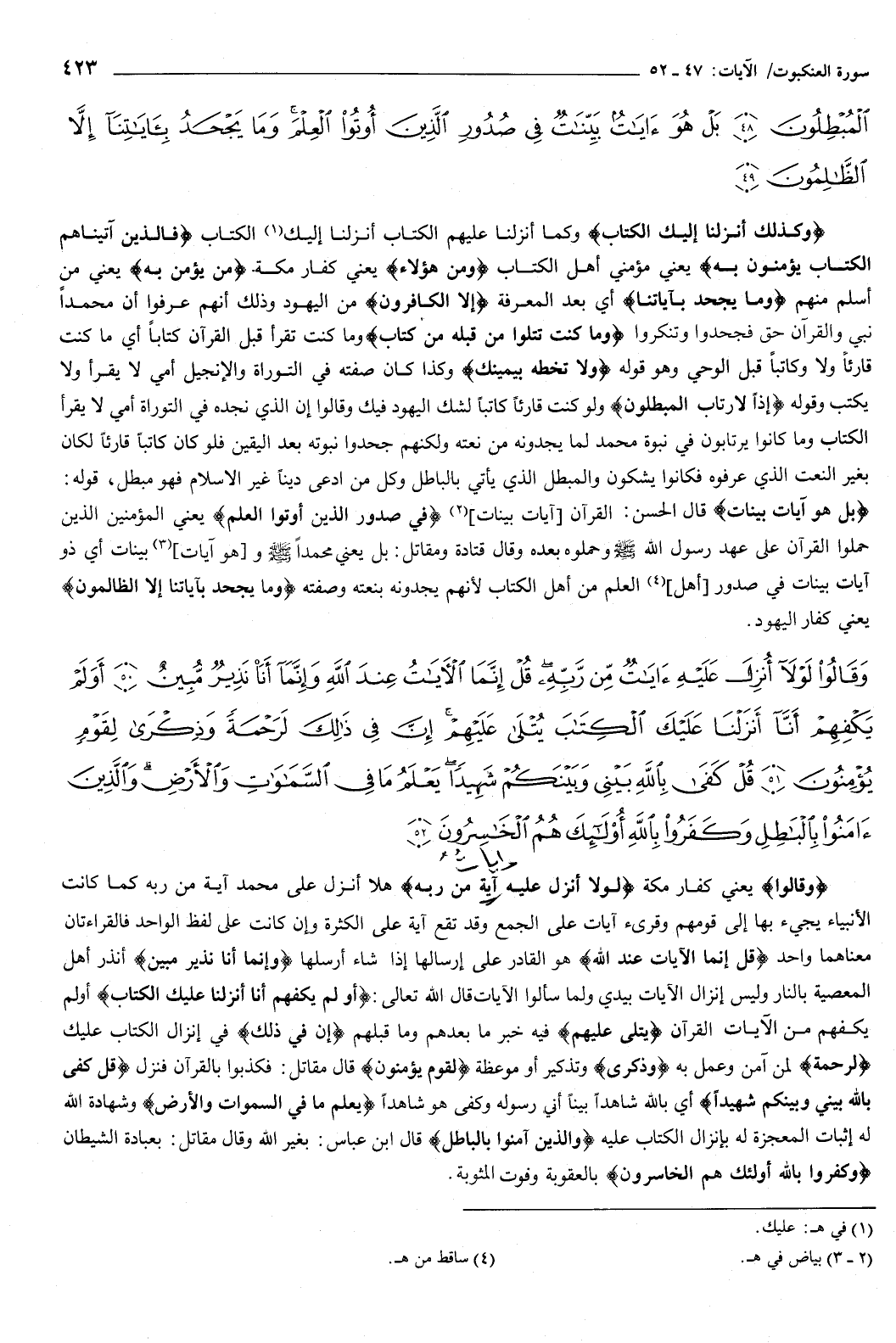 الْمُبْطِلُونَ {48} بَلْ هُوَ آيَاتٌ بَيِّنَاتٌ فِي صُدُورِ الَّذِينَ أُوتُوا الْعِلْمَ وَمَا يَجْحَدُ بِآيَاتِنَا إِلا الظَّالِمُونَ {49} } [العنكبوت: 47-49] {وَكَذَلِكَ أَنْزَلْنَا إِلَيْكَ الْكِتَابَ} [العنكبوت: 47] وكما أنزلنا عليهم الكتاب أنزلنا إليك الكتاب، {فَالَّذِينَ آتَيْنَاهُمُ الْكِتَابَ يُؤْمِنُونَ بِهِ} [العنكبوت: 47] يعني: مؤمني أهل الكتاب، ومن هؤلاء يعني: كفار مكة، {مَنْ يُؤْمِنُ بِهِ} [العنكبوت: 47] يعني: من أسلم منهم، {وَمَا يَجْحَدُ بِآيَاتِنَا} [العنكبوت: 47] أي: بعد المعرفة، إلا الكافرون من اليهود، وذلك أنهم عرفوا أن محمدا نبي، والقرآن حق، فجحدوا وتنكروا.