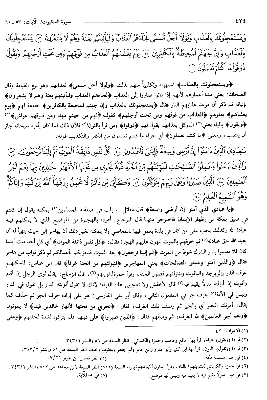 {وَقَالُوا لَوْلا أُنْزِلَ عَلَيْهِ آيَاتٌ مِنْ رَبِّهِ قُلْ إِنَّمَا الآيَاتُ عِنْدَ اللَّهِ وَإِنَّمَا أَنَا نَذِيرٌ مُبِينٌ {50} أَوَلَمْ يَكْفِهِمْ أَنَّا أَنْزَلْنَا عَلَيْكَ الْكِتَابَ يُتْلَى عَلَيْهِمْ إِنَّ فِي ذَلِكَ لَرَحْمَةً وَذِكْرَى لِقَوْمٍ يُؤْمِنُونَ {51} قُلْ كَفَى بِاللَّهِ بَيْنِي وَبَيْنَكُمْ شَهِيدًا يَعْلَمُ مَا فِي السَّمَوَاتِ وَالأَرْضِ وَالَّذِينَ آمَنُوا بِالْبَاطِلِ وَكَفَرُوا بِاللَّهِ أُولَئِكَ هُمُ الْخَاسِرُونَ {52} } [العنكبوت: 50-52] {وَيَسْتَعْجِلُونَكَ بِالْعَذَابِ} [العنكبوت: 53] استهزاء وتكذيبا منهم بذلك، {وَلَوْلا أَجَلٌ مُسَمًّى} [العنكبوت: 53] لعذابهم، وهو يوم القيامة، وقال الضحاك: يعني مدة أعمارهم، لأنهم إذا ماتوا صاروا إلى العذاب.