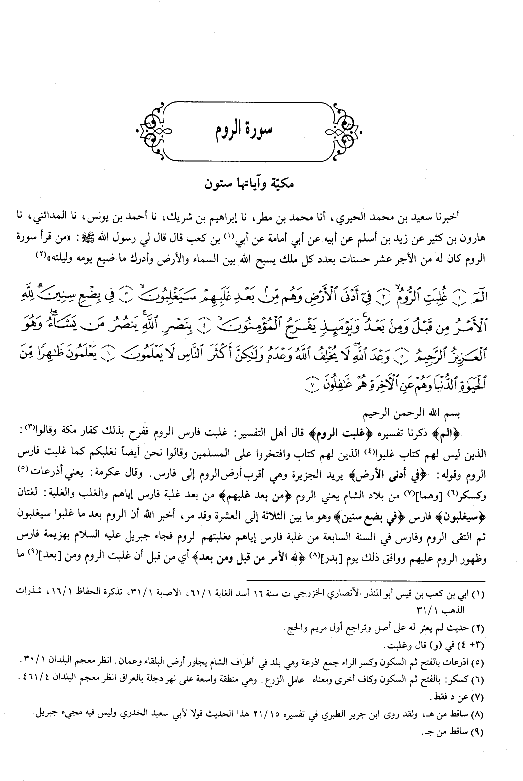{الم {1} غُلِبَتِ الرُّومُ {2} فِي أَدْنَى الأَرْضِ وَهُمْ مِنْ بَعْدِ غَلَبِهِمْ سَيَغْلِبُونَ {3} فِي بِضْعِ سِنِينَ لِلَّهِ الأَمْرُ مِنْ قَبْلُ وَمِنْ بَعْدُ وَيَوْمَئِذٍ يَفْرَحُ الْمُؤْمِنُونَ {4} بِنَصْرِ اللَّهِ يَنْصُرُ مَنْ يَشَاءُ وَهُوَ الْعَزِيزُ الرَّحِيمُ {5} وَعْدَ اللَّهِ لا يُخْلِفُ اللَّهُ وَعْدَهُ وَلَكِنَّ أَكْثَرَ النَّاسِ لا يَعْلَمُونَ {6} يَعْلَمُونَ ظَاهِرًا مِنَ الْحَيَاةِ الدُّنْيَا وَهُمْ عَنِ الآخِرَةِ هُمْ غَافِلُونَ {7} } [الروم: 1-7] بسم الله الرحمن الرحيم الم ذكرنا تفسيره.