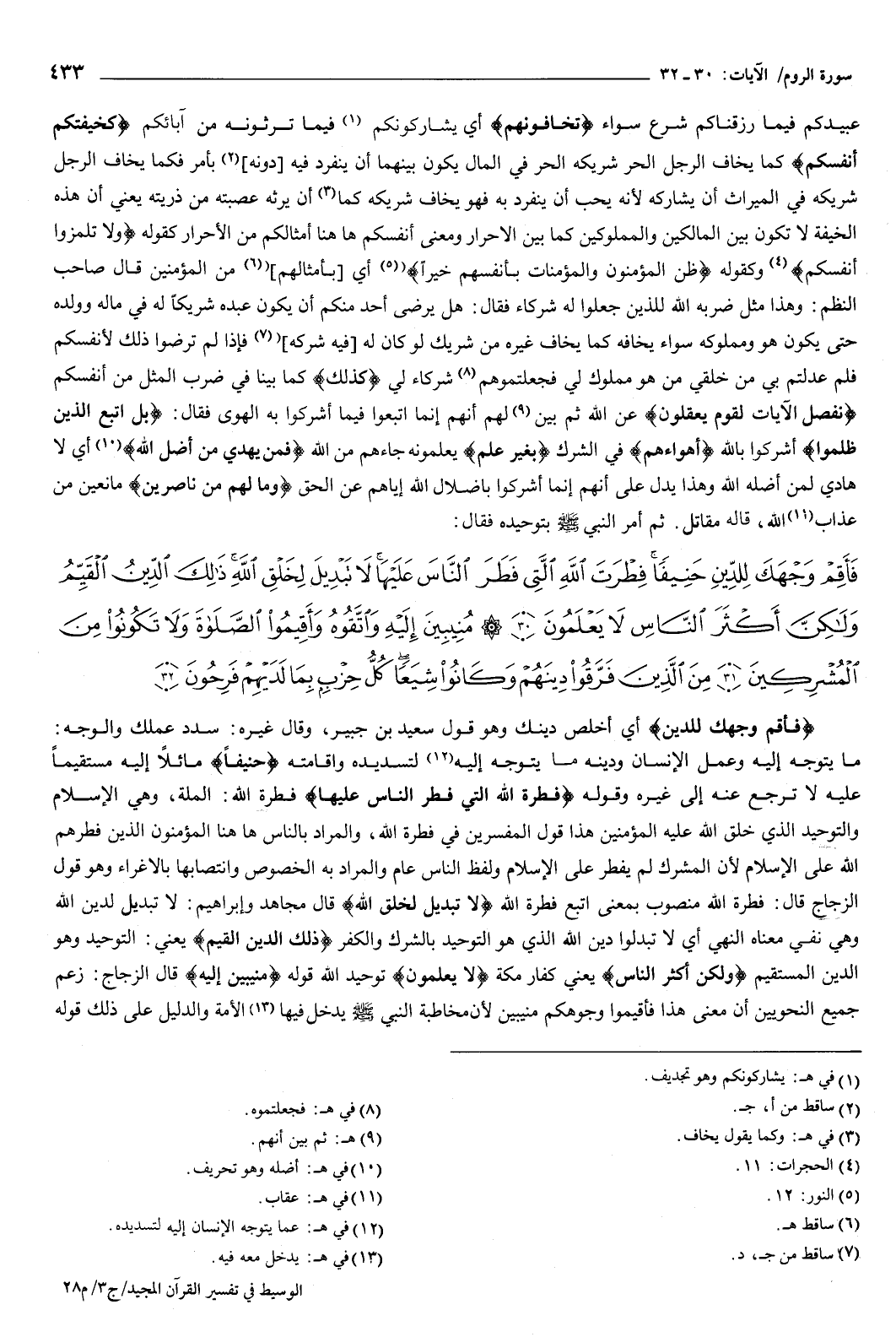 والوجه: ما يتوجه إليه، وعمل الإنسان ودينه ما يتوجه إليه لتسديده وإقامته، حنيفا مائلا إليه مستقيما عليه، لا ترجع عنه إلى غيره، وقوله: {فِطْرَةَ اللَّهِ الَّتِي فَطَرَ النَّاسَ عَلَيْهَا} [الروم: 30] فطرة الله: الملة، وهي الإسلام والتوحيد الذي خلق الله عليه المؤمنين، هذا قول المفسرين في فطرة الله.