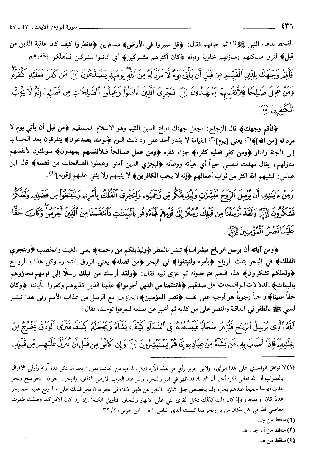 قوله: {وَمِنْ آيَاتِهِ أَنْ يُرْسِلَ الرِّيَاحَ مُبَشِّرَاتٍ وَلِيُذِيقَكُمْ مِنْ رَحْمَتِهِ وَلِتَجْرِيَ الْفُلْكُ بِأَمْرِهِ وَلِتَبْتَغُوا مِنْ فَضْلِهِ وَلَعَلَّكُمْ تَشْكُرُونَ {46} وَلَقَدْ أَرْسَلْنَا مِنْ قَبْلِكَ رُسُلا إِلَى قَوْمِهِمْ فَجَاءُوهُمْ بِالْبَيِّنَاتِ فَانْتَقَمْنَا مِنَ الَّذِينَ أَجْرَمُوا وَكَانَ حَقًّا عَلَيْنَا نَصْرُ الْمُؤْمِنِينَ {47} } [الروم: 46-47] {وَمِنْ آيَاتِهِ أَنْ يُرْسِلَ الرِّيَاحَ مُبَشِّرَاتٍ} [الروم: 46] تبشر بالمطر، {وَلِيُذِيقَكُمْ مِنْ رَحْمَتِهِ} [الروم: 46] يعني: الغيث والخصب، ولتجري الفلك في البحر بتلك الرياح، بأمره ولتبتغوا في البحر، من فضله يعني: الرزق بالتجارة وكل هذا بالرياح، ولعلكم تشكرون هذه النعم فتوحدونه.