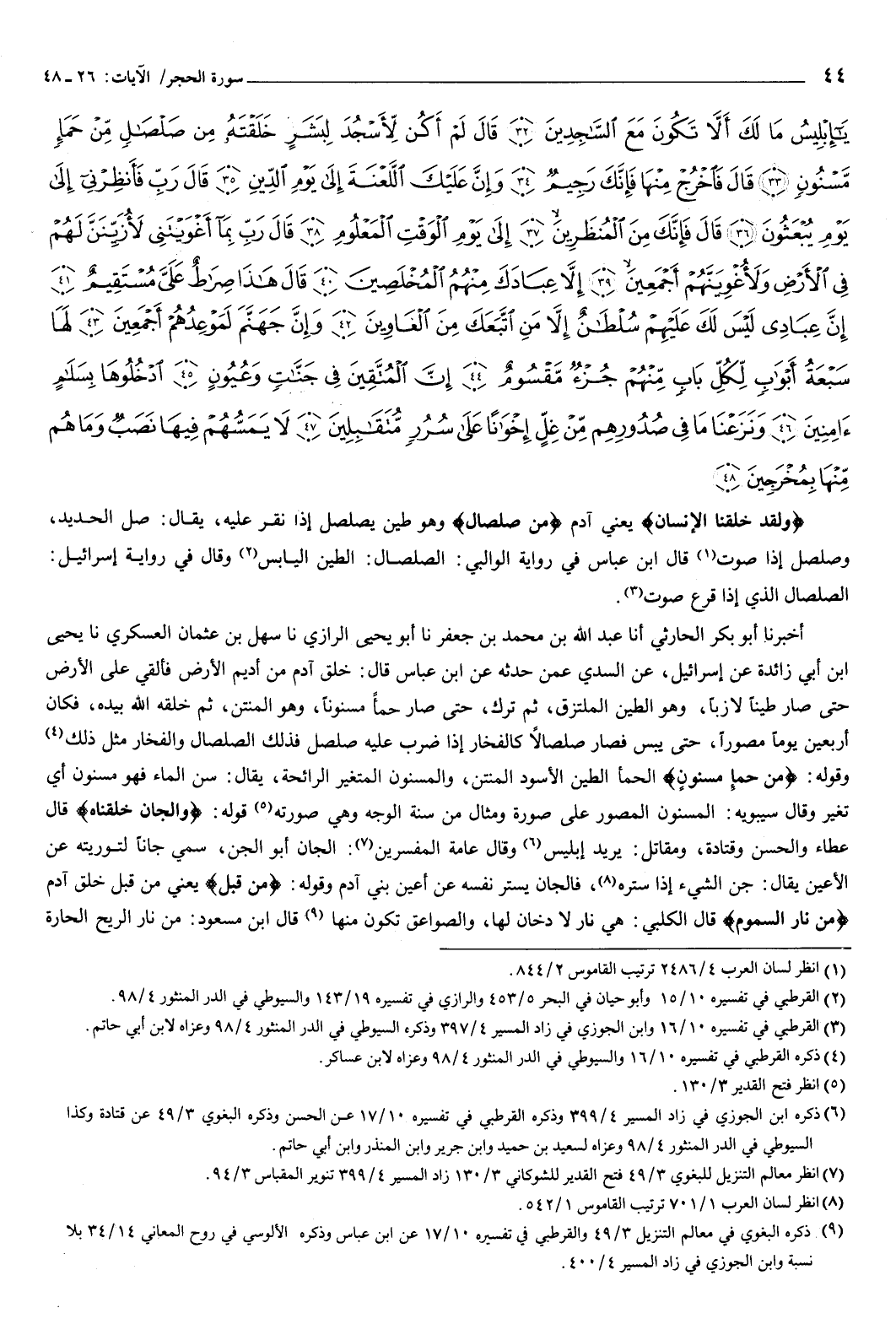 يَا إِبْلِيسُ مَا لَكَ أَلَّا تَكُونَ مَعَ السَّاجِدِينَ {32} قَالَ لَمْ أَكُنْ لأَسْجُدَ لِبَشَرٍ خَلَقْتَهُ مِنْ صَلْصَالٍ مِنْ حَمَإٍ مَسْنُونٍ {33} قَالَ فَاخْرُجْ مِنْهَا فَإِنَّكَ رَجِيمٌ {34} وَإِنَّ عَلَيْكَ اللَّعْنَةَ إِلَى يَوْمِ الدِّينِ {35} قَالَ رَبِّ فَأَنْظِرْنِي إِلَى يَوْمِ يُبْعَثُونَ {36} قَالَ فَإِنَّكَ مِنَ الْمُنْظَرِينَ {37} إِلَى يَوْمِ الْوَقْتِ الْمَعْلُومِ {38} قَالَ رَبِّ بِمَا أَغْوَيْتَنِي لأُزَيِّنَنَّ لَهُمْ فِي الأَرْضِ وَلأُغْوِيَنَّهُمْ أَجْمَعِينَ {39} إِلا عِبَادَكَ مِنْهُمُ الْمُخْلَصِينَ {40} قَالَ هَذَا صِرَاطٌ عَلَيَّ مُسْتَقِيمٌ {41} إِنَّ عِبَادِي لَيْسَ لَكَ عَلَيْهِمْ سُلْطَانٌ إِلا مَنِ اتَّبَعَكَ مِنَ الْغَاوِينَ {42} وَإِنَّ جَهَنَّمَ لَمَوْعِدُهُمْ أَجْمَعِينَ {43} لَهَا سَبْعَةُ أَبْوَابٍ لِكُلِّ بَابٍ مِنْهُمْ جُزْءٌ مَقْسُومٌ {44} إِنَّ الْمُتَّقِينَ فِي جَنَّاتٍ وَعُيُونٍ {45} ادْخُلُوهَا بِسَلامٍ آمِنْينَ {46} وَنَزَعْنَا مَا فِي صُدُورِهِمْ مِنْ غِلٍّ إِخْوَانًا عَلَى سُرُرٍ مُتَقَابِلِينَ {47} لا يَمَسُّهُمْ فِيهَا نَصَبٌ وَمَا هُمْ مِنْهَا بِمُخْرَجِينَ {48} } [الحجر: 26-48] {وَلَقَدْ خَلَقْنَا الإِنْسَانَ} [الحجر: 26] يعني آدم، من صلصال وهو طين يصلصل إذا نقر عليه، يقال: صل الحديد وصلصل إذا صوت.