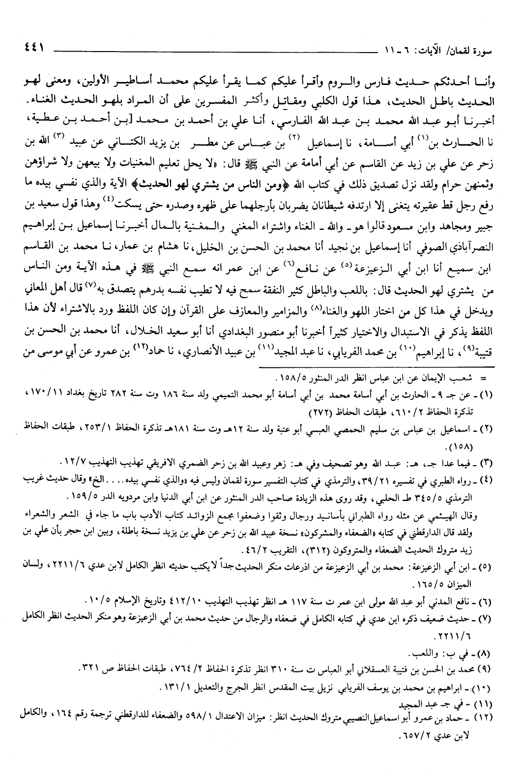 722 - أَخْبَرَنَا إِسْمَاعِيلُ بْنُ إِبْرَاهِيمَ النَّصْرَابَاذِيُّ الصُّوفِيُّ، أنا إِسْمَاعِيلُ بْنُ نُجَيْدٍ، أنا مُحَمَّدُ بْنُ الْحَسَنِ بْنِ الْخَلِيلِ، نا هِشَامُ بْنُ عَمَّارٍ، نا مُحَمَّدُ بْنُ الْقَاسِمِ بْنِ سُمَيْعٍ، أنا ابْنُ أَبِي الزُّعَيْزِعَةِ، عَنْ نَافِعٍ، عَنِ ابْنِ عُمَرَ، أَنَّهُ سَمِعَ النَّبِيَّ، صَلَّى اللهُ عَلَيْهِ وَسَلَّمَ، فِي هَذِهِ الآيَةِ، {وَمِنَ النَّاسِ مَنْ يَشْتَرِي لَهْوَ الْحَدِيثِ} قَالَ: بِاللَّعِبِ وَالْبَاطِلِ، كَثِيرُ النَّفَقَةِ، سَمْحٌ فِيهِ، لا تَطِيبُ نَفْسُهُ بِدِرْهَمٍ يَتَصَدَّقُ بِهِ، قَالَ أَهْلُ الْمَعَانِي: وَيَدْخُلُ فِي هَذَا كُلُّ مَنِ اخْتَارَ اللَّهْوَ وَالْغِنَاءَ وَالْمَزَامِيرَ وَالْمَعَازِفَ عَلَى الْقُرْآنِ، وَإِنْ كَانَ اللَّفْظُ وَرَدَ بِالاشْتِرَاءِ؛ لأَنَّ هَذَا اللَّفْظَ يُذْكَرُ فِي الاسْتِبْدَالِ وَالاخْتِيَارِ كَثِيرًا