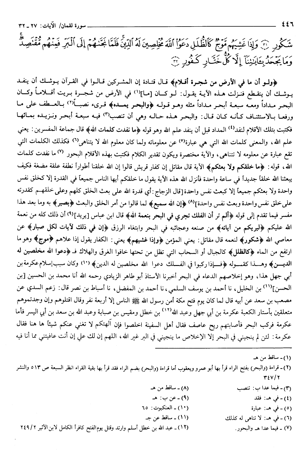 شَكُورٍ {31} وَإِذَا غَشِيَهُمْ مَوْجٌ كَالظُّلَلِ دَعَوُا اللَّهَ مُخْلِصِينَ لَهُ الدِّينَ فَلَمَّا نَجَّاهُمْ إِلَى الْبَرِّ فَمِنْهُمْ مُقْتَصِدٌ وَمَا يَجْحَدُ بِآيَاتِنَا إِلا كُلُّ خَتَّارٍ كَفُورٍ {32} } [لقمان: 27-32] {وَلَوْ أَنَّمَا فِي الأَرْضِ مِنْ شَجَرَةٍ أَقْلامٌ} [لقمان: 27] قال قتادة: إن المشركين قالوا في القرآن: يوشك أن ينفد، يوشك أن ينقطع.