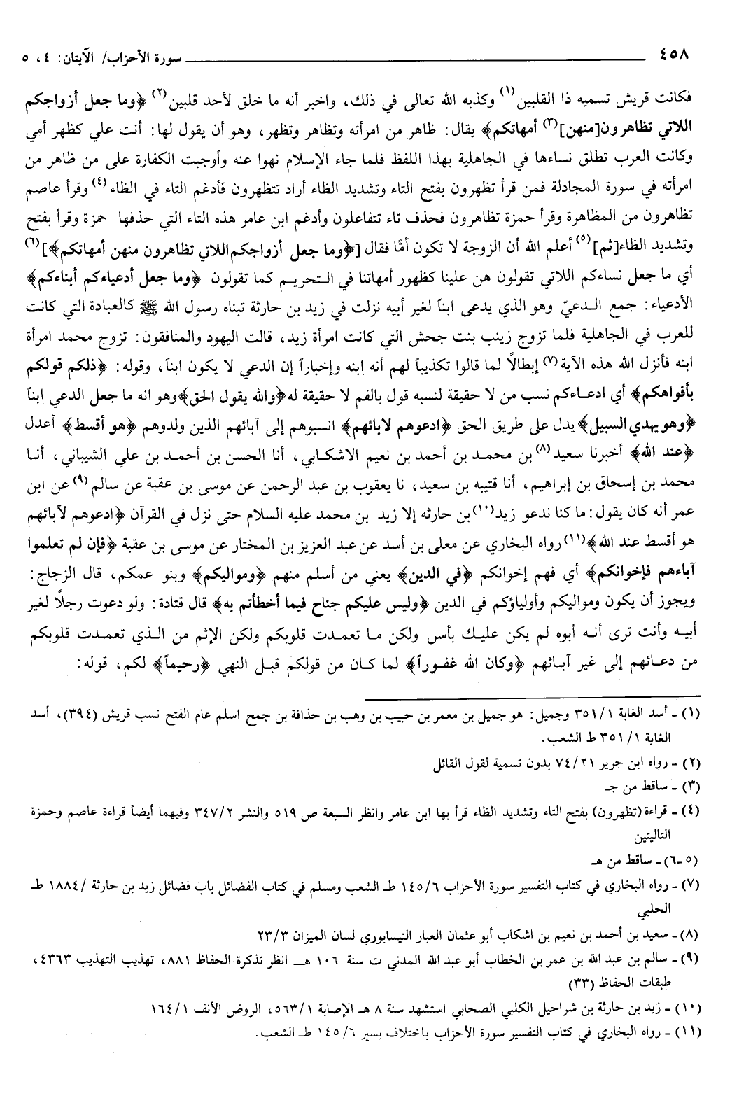 فكانت قريش تسميه ذا القلبين، وكذبه الله تعالى في ذلك، وأخبر أنه ما خلق لأحد قلبين، {وَمَا جَعَلَ أَزْوَاجَكُمُ اللَّائِي تُظَاهِرُونَ مِنْهُنَّ أُمَّهَاتِكُمْ} [الأحزاب: 4] يقال: ظاهر من امرأته وتظاهر وتظهر، وهو أن يقول لها: أنت عليّ كظهر أمي، وكانت العرب تطلق نساءها في الجاهلية بهذا اللفظ، فلما جاء الإسلام نُهُوا عنه، وأوجبت الكفارة على من ظاهر من امرأته في { [المجادلة، فمن قرأ تظهرون بفتح التاء وتشديد الظاء أراد تتظهرون، فأدغم التاء في الظاء، وقرأ عاصم تظاهرون من المظاهرة، وقرأ حمزة تظاهرون فحذف تاء تتفاعلون، وأدغم ابن عامر هذه التاء التي حذفها حمزة وقرأ بفتح وتشديد الظاء، ثم أعلم الله أن الزوجة لا تكون أُمًا، فقال:] وَمَا جَعَلَ أَزْوَاجَكُمُ اللَّائِي تُظَاهِرُونَ مِنْهُنَّ أُمَّهَاتِكُمْ} [سورة الأحزاب: 4] أي: ما جعل نساءكم اللاتي تقولون هُنَّ علينا كظهور أمهاتنا في التحريم كما تقولون، {وَمَا جَعَلَ أَدْعِيَاءَكُمْ أَبْنَاءَكُمْ} [الأحزاب: 4] الأدعياء جمع الدَّعِيُّ، وهو الذي يدعى ابنا لغير أبيه، نزلت في زيد بن حارثة، تبناه رسول الله صَلَّى اللهُ عَلَيْهِ وَسَلَّمَ كالعبادة التي كانت للعرب في الجاهلية، فلما تزوج زينب بنت جحش التي كانت امرأة زيد، قلت اليهود والمنافقون: تزوج محمد امرأة ابنه.