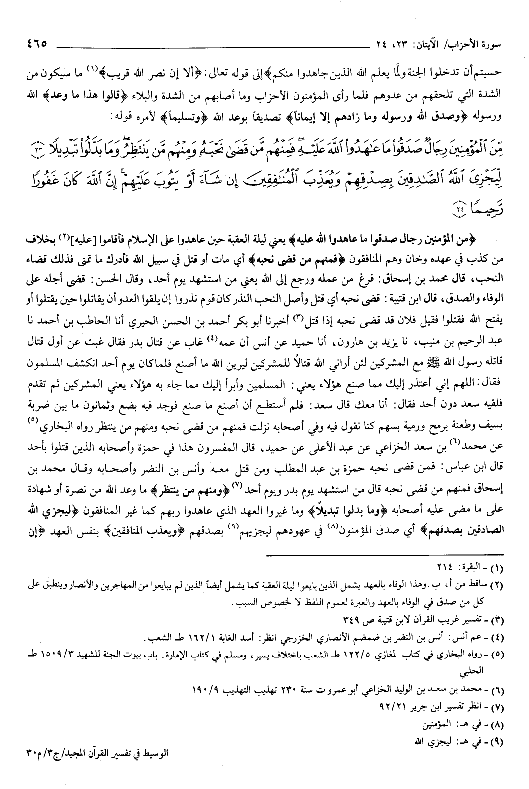 قوله: {مِنَ الْمُؤْمِنِينَ رِجَالٌ صَدَقُوا مَا عَاهَدُوا اللَّهَ عَلَيْهِ فَمِنْهُمْ مَنْ قَضَى نَحْبَهُ وَمِنْهُمْ مَنْ يَنْتَظِرُ وَمَا بَدَّلُوا تَبْدِيلا {23} لِيَجْزِيَ اللَّهُ الصَّادِقِينَ بِصِدْقِهِمْ وَيُعَذِّبَ الْمُنَافِقِينَ إِنْ شَاءَ أَوْ يَتُوبَ عَلَيْهِمْ إِنَّ اللَّهَ كَانَ غَفُورًا رَحِيمًا {24} } [الأحزاب: 23-24] {مِنَ الْمُؤْمِنِينَ رِجَالٌ صَدَقُوا مَا عَاهَدُوا اللَّهَ عَلَيْهِ} [الأحزاب: 23] يعني ليلة العقبة حين عاهدوا على الإسلام فأقاموا عليه بخلاف من كذب في عهده وخان، وهم المنافقون، {فَمِنْهُمْ مَنْ قَضَى نَحْبَهُ} [الأحزاب: 23] أي: مات أو قتل في سبيل الله فأدرك ما تمنى، فذلك قضاء النحب، قال محمد بن إسحاق: فرغ من عمله ورجع إلى الله يعني من استشهد يوم أحد.