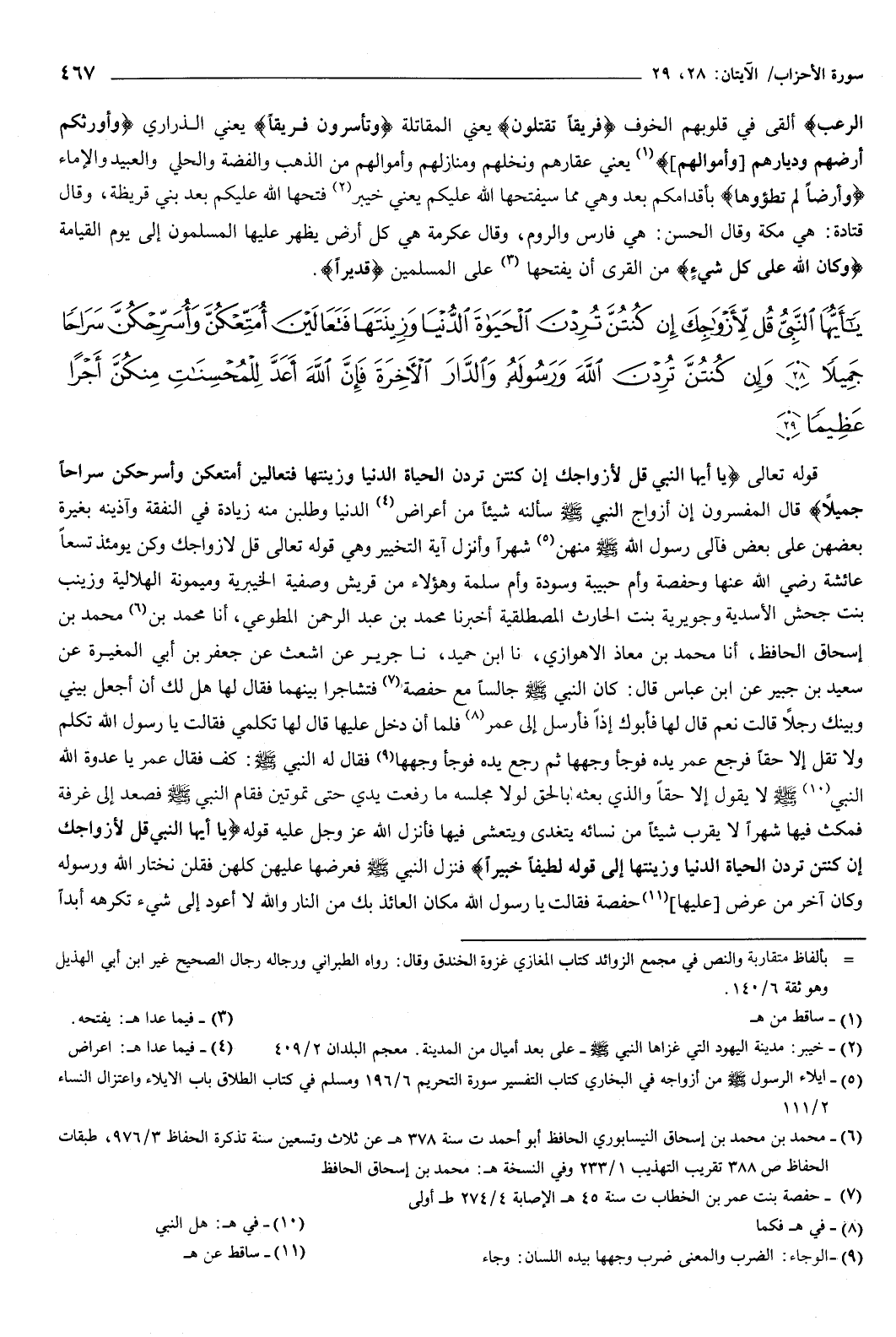 {يَأَيُّهَا النَّبِيُّ قُلْ لأَزْوَاجِكَ إِنْ كُنْتُنَّ تُرِدْنَ الْحَيَاةَ الدُّنْيَا وَزِينَتَهَا فَتَعَالَيْنَ أُمَتِّعْكُنَّ وَأُسَرِّحْكُنَّ سَرَاحًا جَمِيلا {28} وَإِنْ كُنْتُنَّ تُرِدْنَ اللَّهَ وَرَسُولَهُ وَالدَّارَ الآخِرَةَ فَإِنَّ اللَّهَ أَعَدَّ لِلْمُحْسِنَاتِ مِنْكُنَّ أَجْرًا عَظِيمًا {29} } [الأحزاب: 28-29] قوله تعالى: {يَأَيُّهَا النَّبِيُّ قُلْ لأَزْوَاجِكَ إِنْ كُنْتُنَّ تُرِدْنَ الْحَيَاةَ الدُّنْيَا وَزِينَتَهَا فَتَعَالَيْنَ أُمَتِّعْكُنَّ وَأُسَرِّحْكُنَّ سَرَاحًا جَمِيلا} [الأحزاب: 28] قال المفسرون: إن أزواج النبي صَلَّى اللهُ عَلَيْهِ وَسَلَّمَ سألنه شيئا من أعراض الدنيا، وطلبن منه زيادة في النفقة، وآذينه بغيرة بعضهن على بعض، فآلى رسول الله صَلَّى اللهُ عَلَيْهِ وَسَلَّمَ منهن شهرا، وأنزل آية التخيير، وهي قوله تعالى: {قُلْ لأَزْوَاجِكَ} [الأحزاب: 28] وكن يومئذ تسعا: عائشة رضي الله عنها، وحفصة، وأم حبيبة، وسودة، وأم سلمة، وهؤلاء من قريش، وصفية الخيبرية، وميمونة الهلالية، وزينب بنت جحش الأسدية، وجويرية بنت الحارث المصطلقية.