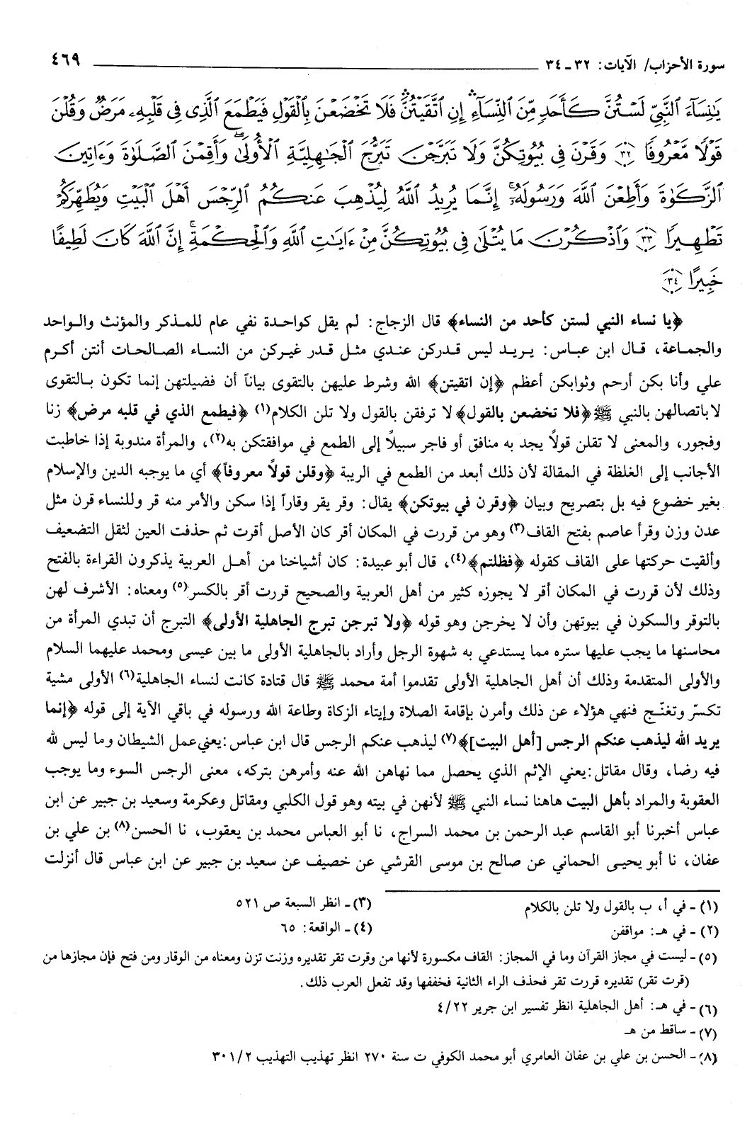 يَا نِسَاءَ النَّبِيِّ لَسْتُنَّ كَأَحَدٍ مِنَ النِّسَاءِ إِنِ اتَّقَيْتُنَّ فَلا تَخْضَعْنَ بِالْقَوْلِ فَيَطْمَعَ الَّذِي فِي قَلْبِهِ مَرَضٌ وَقُلْنَ قَوْلا مَعْرُوفًا {32} وَقَرْنَ فِي بُيُوتِكُنَّ وَلا تَبَرَّجْنَ تَبَرُّجَ الْجَاهِلِيَّةِ الأُولَى وَأَقِمْنَ الصَّلاةَ وَآتِينَ الزَّكَاةَ وَأَطِعْنَ اللَّهَ وَرَسُولَهُ إِنَّمَا يُرِيدُ اللَّهُ لِيُذْهِبَ عَنْكُمُ الرِّجْسَ أَهْلَ الْبَيْتِ وَيُطَهِّرَكُمْ تَطْهِيرًا {33} وَاذْكُرْنَ مَا يُتْلَى فِي بُيُوتِكُنَّ مِنْ آيَاتِ اللَّهِ وَالْحِكْمَةِ إِنَّ اللَّهَ كَانَ لَطِيفًا خَبِيرًا {34} } [الأحزاب: 32-34] {يَا نِسَاءَ النَّبِيِّ لَسْتُنَّ كَأَحَدٍ مِنَ النِّسَاءِ} [الأحزاب: 32] قال الزجاج: لم يقل كواحدة نفي عام للمذكر والمؤنث والواحد والجماعة.