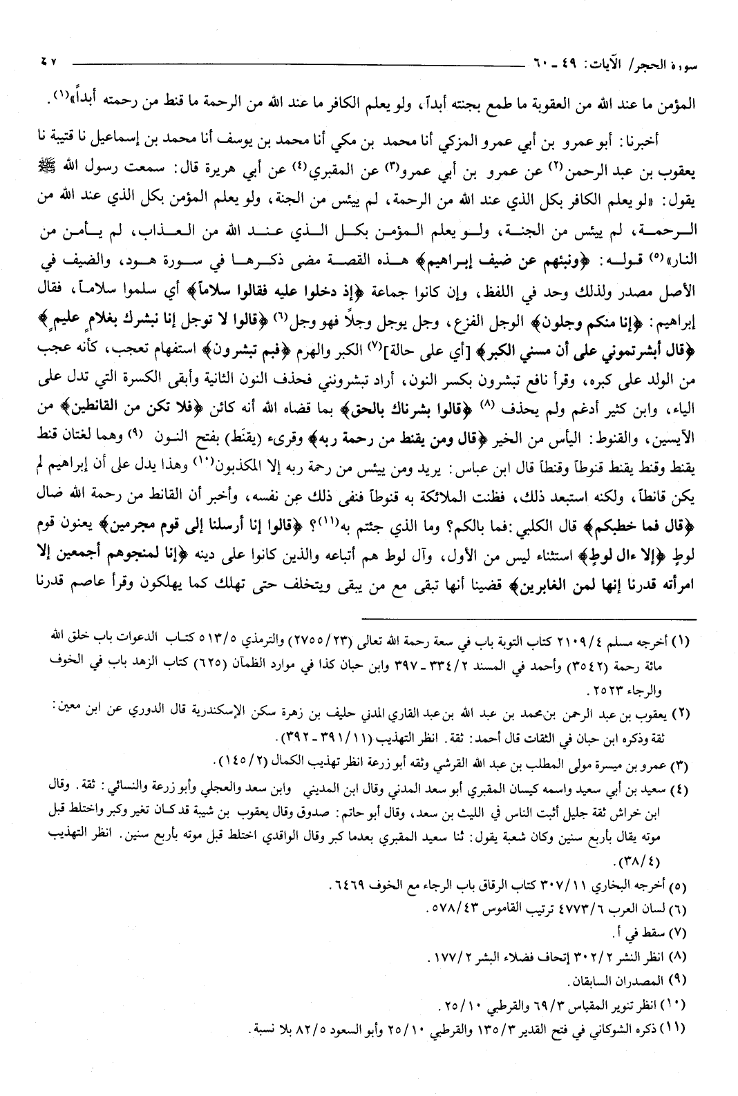 509 - أَخْبَرَنَا أَبُو عَمْرِو بْنُ أَبِي عَمْرٍو الْمُزَكِّي، أنا مُحَمَّدُ بْنُ مَكِّيٍّ، أنا مُحَمَّدُ بْنُ يُوسُفَ، أنا مُحَمَّدُ بْنُ إِسْمَاعِيلَ، نا قُتَيْبَةُ، نا يَعْقُوبُ بْنُ عَبْدِ الرَّحْمَنِ، عَنْ عَمْرِو بْنِ أَبِي عَمْرٍو، عَنِ الْمَقْبُرِيِّ، عَنْ أَبِي هُرَيْرَةَ، قَالَ: سَمِعْتُ رَسُولَ اللَّهِ، صَلَّى اللهُ عَلَيْهِ وَسَلَّمَ، يَقُولُ: " لَوْ يَعْلَمُ الْكَافِرُ بِكُلِّ الَّذِي عِنْدَ اللَّهِ مِنَ الرَّحْمَةِ؛ لَمْ يَيْئَسْ مِنَ الْجَنَّةِ، وَلَوْ يَعْلَمُ الْمُؤْمِنُ بِكُلِّ الَّذِي عِنْدَ اللَّهِ مِنَ الرَّحْمَةِ؛ لَمْ يَيْئَسْ مِنَ الْجَنَّةِ، وَلَوْ يَعْلَمُ الْمُؤْمِنُ بِكُلِّ الَّذِي عِنْدَ اللَّهِ مِنَ الْعَذَابِ؛ لَمْ يَأْمَنْ مِنَ النَّارِ