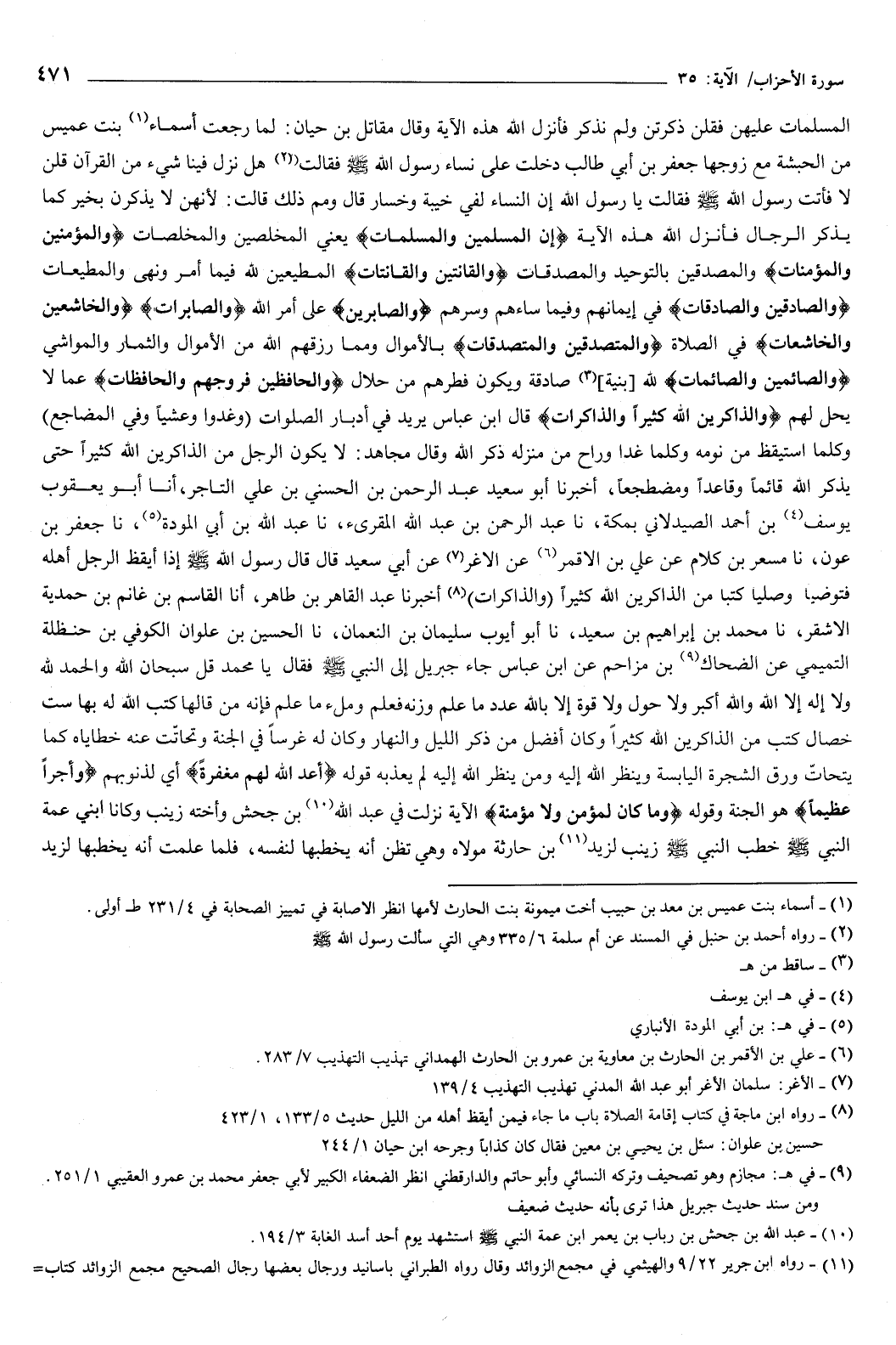 قوله: {أَعَدَّ اللَّهُ لَهُمْ مَغْفِرَةً} [الأحزاب: 35] أي لذنوبهم، وأجرا عظيما هو الجنة، وقوله: {وَمَا كَانَ لِمُؤْمِنٍ وَلا مُؤْمِنَةٍ} [الأحزاب: 36] الآية، نزلت في عبد الله بن جحش وأخته زينب، وكانا ابني عمة النبي صَلَّى اللهُ عَلَيْهِ وَسَلَّمَ، خطب النبي صَلَّى اللهُ عَلَيْهِ وَسَلَّمَ زينب لزيد بن حارثه مولاه، وهي تظن أنه يخطبها لنفسه، فلما علمت أنه يخطبها لزيد