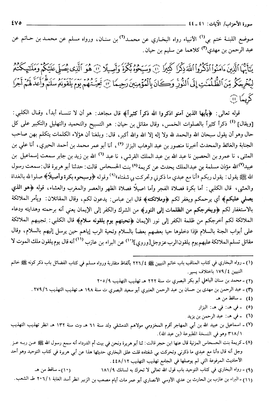 {يَأَيُّهَا الَّذِينَ آمَنُوا اذْكُرُوا اللَّهَ ذِكْرًا كَثِيرًا {41} وَسَبِّحُوهُ بُكْرَةً وَأَصِيلا {42} هُوَ الَّذِي يُصَلِّي عَلَيْكُمْ وَمَلائِكَتُهُ لِيُخْرِجَكُمْ مِنَ الظُّلُمَاتِ إِلَى النُّورِ وَكَانَ بِالْمُؤْمِنِينَ رَحِيمًا {43} تَحِيَّتُهُمْ يَوْمَ يَلْقَوْنَهُ سَلامٌ وَأَعَدَّ لَهُمْ أَجْرًا كَرِيمًا {44} } [الأحزاب: 41-44] قوله تعالى: {يَأَيُّهَا الَّذِينَ آمَنُوا اذْكُرُوا اللَّهَ ذِكْرًا كَثِيرًا} [الأحزاب: 41] قال مجاهد: هو أن لا تنساه أبدا.