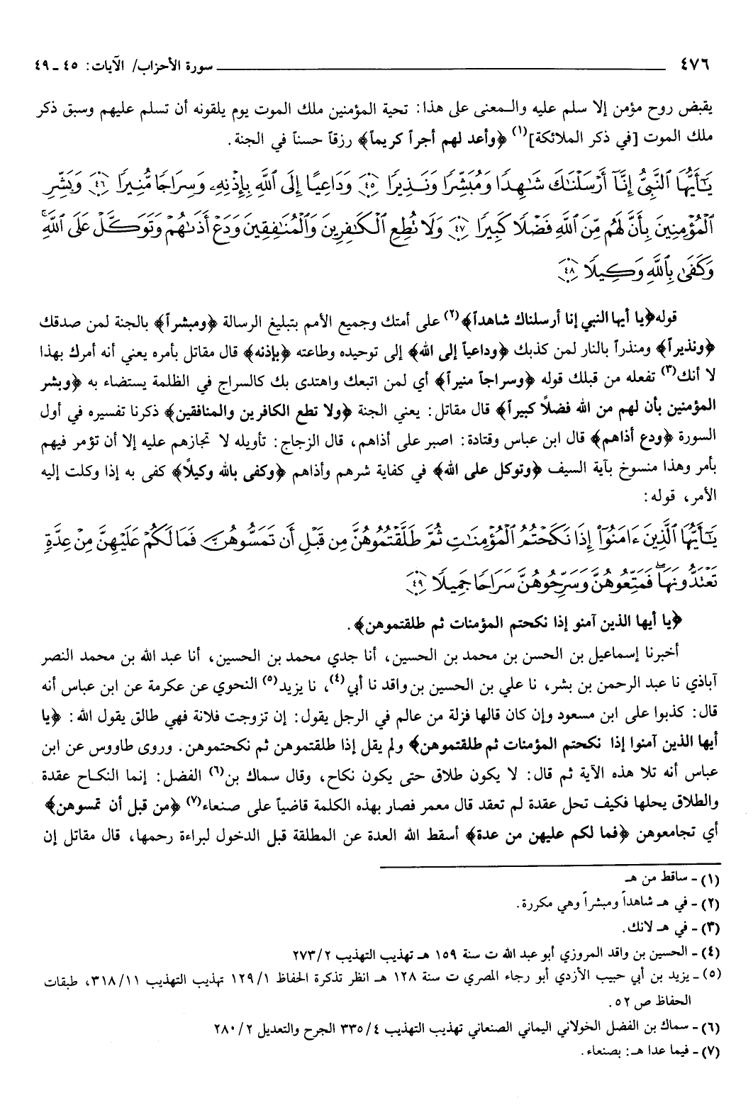 {يَأَيُّهَا النَّبِيُّ إِنَّا أَرْسَلْنَاكَ شَاهِدًا وَمُبَشِّرًا وَنَذِيرًا {45} وَدَاعِيًا إِلَى اللَّهِ بِإِذْنِهِ وَسِرَاجًا مُنِيرًا {46} وَبَشِّرِ الْمُؤْمِنِينَ بِأَنَّ لَهُمْ مِنَ اللَّهِ فَضْلا كَبِيرًا {47} وَلا تُطِعِ الْكَافِرِينَ وَالْمُنَافِقِينَ وَدَعْ أَذَاهُمْ وَتَوَكَّلْ عَلَى اللَّهِ وَكَفَى بِاللَّهِ وَكِيلا {48} } [الأحزاب: 45-48] قوله: {يَأَيُّهَا النَّبِيُّ إِنَّا أَرْسَلْنَاكَ شَاهِدًا} [الأحزاب: 45] على أمتك وجميع الأمم بتبليغ الرسالة، ومبشرا بالجنة لمن صدقك، ونذيرا ومنذرا بالنار لمن كذبك.
