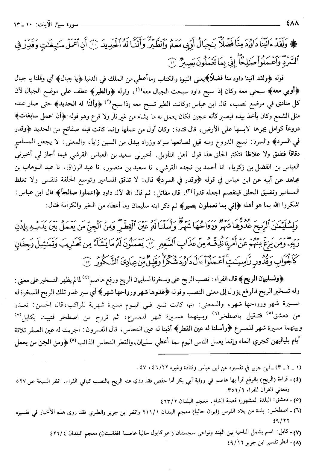 ثم ذكر ابنه سليمان وما أعطاه من الخير والكرامة، فقال: {وَلِسُلَيْمَانَ الرِّيحَ غُدُوُّهَا شَهْرٌ وَرَوَاحُهَا شَهْرٌ وَأَسَلْنَا لَهُ عَيْنَ الْقِطْرِ وَمِنَ الْجِنِّ مَنْ يَعْمَلُ بَيْنَ يَدَيْهِ بِإِذْنِ رَبِّهِ وَمَنْ يَزِغْ مِنْهُمْ عَنْ أَمْرِنَا نُذِقْهُ مِنْ عَذَابِ السَّعِيرِ {12} يَعْمَلُونَ لَهُ مَا يَشَاءُ مِنْ مَحَارِيبَ وَتَمَاثِيلَ وَجِفَانٍ كَالْجَوَابِ وَقُدُورٍ رَاسِيَاتٍ اعْمَلُوا آلَ دَاوُدَ شُكْرًا وَقَلِيلٌ مِنْ عِبَادِيَ الشَّكُورُ {13} } [سبأ: 12-13] {وَلِسُلَيْمَانَ الرِّيحَ} [سبأ: 12] قال الفراء: نصب الريح على وسخرنا لسليمان الريح، ورفع عاصم لما لم يظهر التسخير على معنى وله تسخير الريح، فالرفع يئول إلى معنى النصب، وقوله: {غُدُوُّهَا شَهْرٌ وَرَوَاحُهَا شَهْرٌ} [سبأ: 12] أي: سير غدو تلك الريح المسخرة له مسيرة شهر، ورواحها شهر.