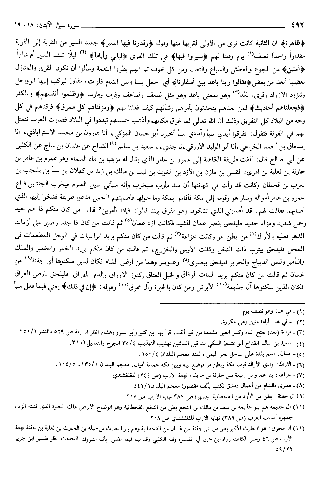 ظاهره أن الثانية كانت ترى من الأولى لقربها منها، وقوله: {وَقَدَّرْنَا فِيهَا السَّيْرَ} [سبأ: 18] جعلنا السير من القرية إلى القرية مقدارا واحدا نصف يوم، قلنا لهم: سيروا فيها في تلك القرى، ليالي وأياما ليلا شئتم السير أم نهارا، آمنين من الجوع والعطش والسباع والتعب، ومن كل خوف.