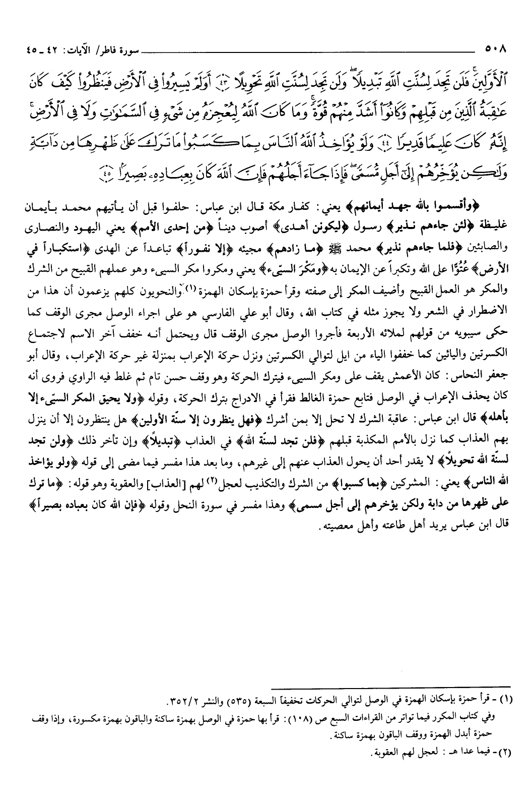 {فَهَلْ يَنْظُرُونَ إِلا سُنَّةَ الأَوَّلِينَ} [فاطر: 43] هل ينتظرون إلا أن ينزل بهم العذاب كما نزل بالأمم المكذبة قبلهم، {فَلَنْ تَجِدَ لِسُنَّةِ اللَّهِ} [فاطر: 43] في العذاب، تبديلا وإن تأخر ذلك، {وَلَنْ تَجِدَ لِسُنَّتِ اللَّهِ تَحْوِيلا} [فاطر: 43] لا يقدر أحد أن يحول العذاب عنهم إلى غيرهم.