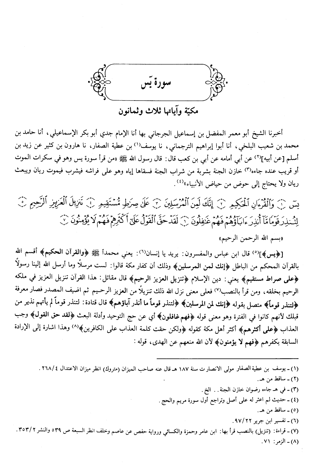 {يس {1} وَالْقُرْءَانِ الْحَكِيمِ {2} إِنَّكَ لَمِنَ الْمُرْسَلِينَ {3} عَلَى صِرَاطٍ مُسْتَقِيمٍ {4} تَنْزِيلَ الْعَزِيزِ الرَّحِيمِ {5} لِتُنْذِرَ قَوْمًا مَا أُنْذِرَ آبَاؤُهُمْ فَهُمْ غَافِلُونَ {6} لَقَدْ حَقَّ الْقَوْلُ عَلَى أَكْثَرِهِمْ فَهُمْ لا يُؤْمِنُونَ {7} } [يس: 1-7] بسم الله الرحمن الرحيم يس قال ابن عباس، والمفسرون: يريد يا إنسان، يعني محمدا صَلَّى اللهُ عَلَيْهِ وَسَلَّمَ.