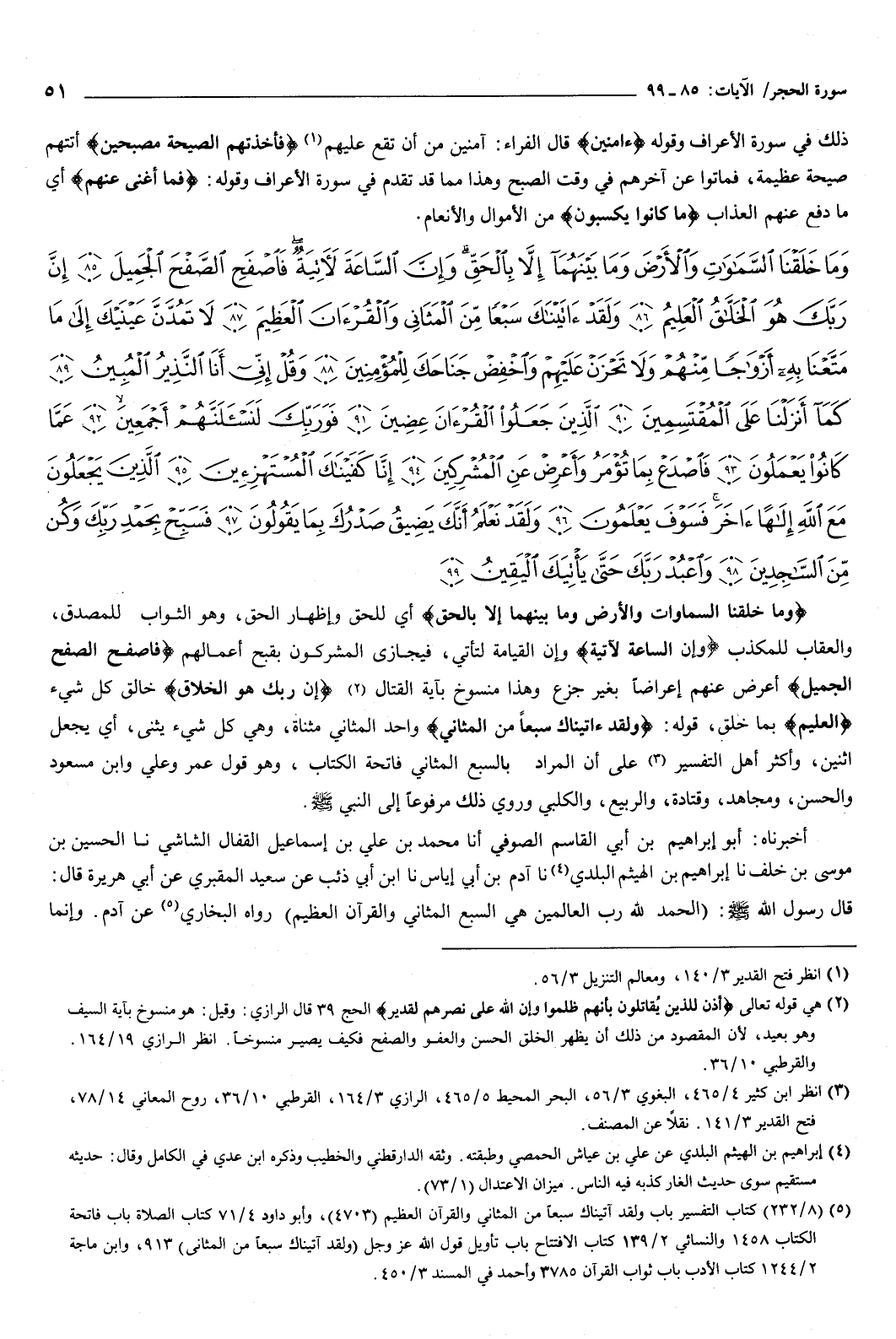 قوله: {وَلَقَدْ آتَيْنَاكَ سَبْعًا مِنَ الْمَثَانِي} [الحجر: 87] واحد المثاني مثناة، وهي كل شيء يثنى، أي يجعل اثنين، وأكثر أهل التفسير على أن المراد بالسبع المثاني فاتحة الكتاب، وهو قول عمر، وعليّ، وابن مسعود، والحسن، ومجاهد، وقتادة، والربيع، والكلبي، وروي ذلك مرفوعا إلى النبي صَلَّى اللهُ عَلَيْهِ وَسَلَّمَ.