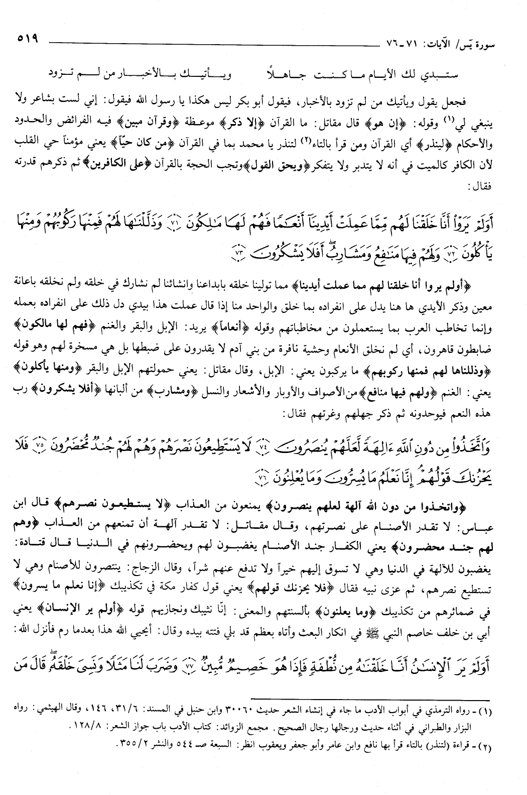 ثم ذكرهم قدرته، فقال: {أَوَلَمْ يَرَوْا أَنَّا خَلَقْنَا لَهُمْ مِمَّا عَمِلَتْ أَيْدِينَا أَنْعَامًا فَهُمْ لَهَا مَالِكُونَ {71} وَذَلَّلْنَاهَا لَهُمْ فَمِنْهَا رَكُوبُهُمْ وَمِنْهَا يَأْكُلُونَ {72} وَلَهُمْ فِيهَا مَنَافِعُ وَمَشَارِبُ أَفَلا يَشْكُرُونَ {73} } [يس: 71-73] {أَوَلَمْ يَرَوْا أَنَّا خَلَقْنَا لَهُمْ مِمَّا عَمِلَتْ أَيْدِينَا} [يس: 71] مما تولينا خلقه بإبداعنا وإنشائنا لم نشارك في خلقه ولم نخلقه بإعانة معين، وذكر الأيدي ههنا يدل على إنفراده بما خلق، والواحد منا إذا قال عملت هذا بيدي دل ذلك على إنفراده بعمله، وإنما تخاطب العرب بما يستعملون من مخاطباتهم، وقوله: أنعاما يريد: الإبل والبقر والغنم، {فَهُمْ لَهَا مَالِكُونَ} [يس: 71] ضابطون قاهرون، أي: لم نخلق الأنعام وحشية نافرة من بني آدم لا يقدرون على ضبطها، بل هي مسخرة لهم.