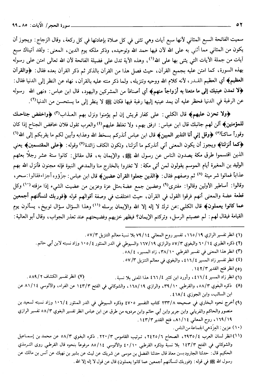 وهذه الآية تدل على فضيلة الفاتحة لأن الله تعالى امتن على رسوله بهذه ال { [، كما امتن عليه بجميع القرآن، حيث فصل هذا من القرآن بالذكر، ثم ذكر القرآن بعده، فقال: والقرءان العظيم أي: العظيم القدر، لأنه كلام الله ووحيه وتنزيله، ولما ذكر منته عليه بالقرآن، نهاه عن النظر إلى الدنيا، فقال:] لا تَمُدَّنَّ عَيْنَيْكَ إِلَى مَا مَتَّعْنَا بِهِ أَزْوَاجًا مِنْهُمْ} [سورة الحجر: 88] أي: أصنافا من المشركين واليهود، قال ابن عباس: «نهى اللهُ رسولَه عن الرغبة في الدنيا، فحظر عليه أن يمد عينيه إليها رغبة فيها، فكان صَلَّى اللهُ عَلَيْهِ وَسَلَّمَ لا ينظر إلى ما يستحسن من الدنيا» .