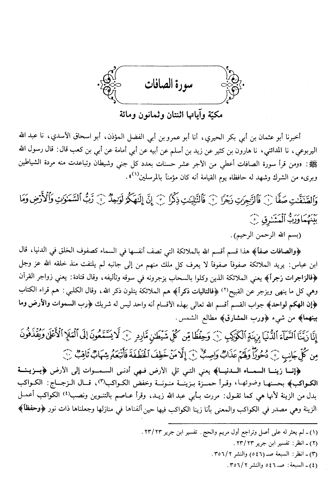 {وَالصَّافَّاتِ صَفًّا {1} فَالزَّاجِرَاتِ زَجْرًا {2} فَالتَّالِيَاتِ ذِكْرًا {3} إِنَّ إِلَهَكُمْ لَوَاحِدٌ {4} رَبُّ السَّمَوَاتِ وَالأَرْضِ وَمَا بَيْنَهُمَا وَرَبُّ الْمَشَارِقِ {5} } [الصافات: 1-5] بسم الله الرحمن الرحيم والصافات صفا هذا قسم أقسم الله بالملائكة التي تصف أنفسها في السماء كصفوف الخلق في الدنيا، قال ابن عباس: يريد الملائكة صفوفا صفوفا، لا يعرف كل ملك منهم من إلى جانبه، لم يلتفت منذ خلقه الله عز وجل.