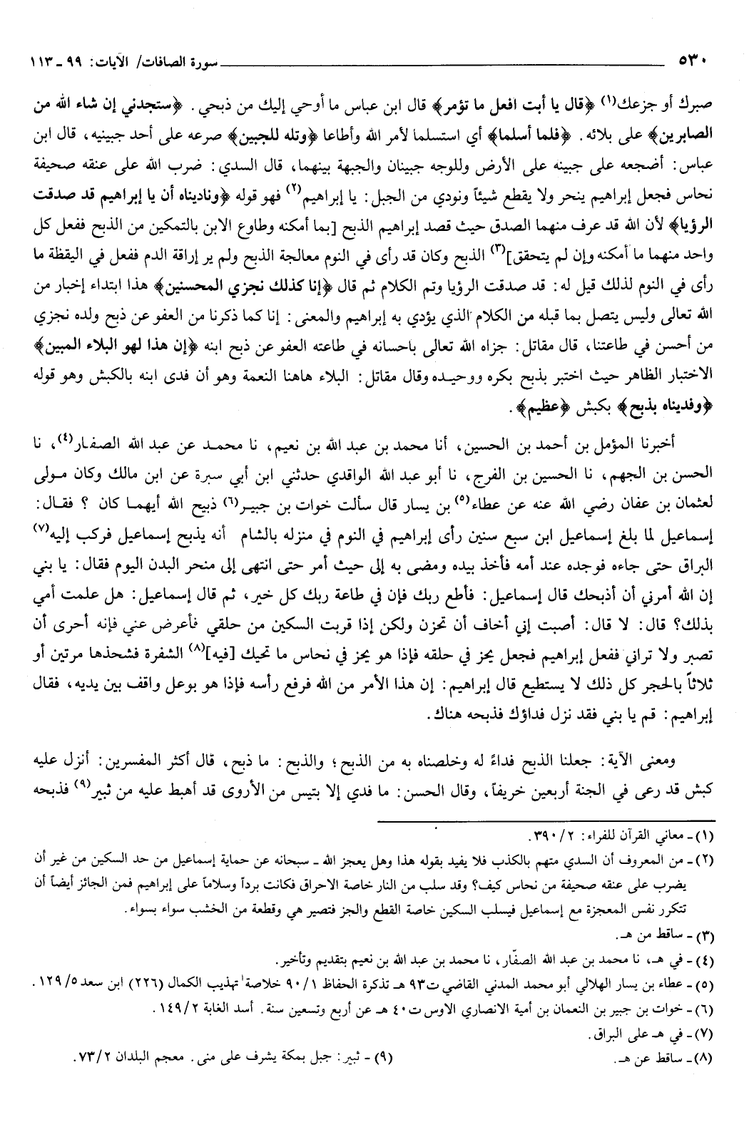 فَفَعَلَ إِبْرَاهِيمُ، فَجَعَلَ يَحُزُّ فِي حَلْقِهِ فَإِذَا هُوَ يَحُزُّ فِي نُحَاسٍ مَا تَحِيكُ فِيهِ الشَّفْرَةُ، فَشَحَذَهَا مَرَّتَيْنِ أَوْ ثَلاثًا بِالْحَجَرِ، كُلُّ ذَلِكَ لا يَسْتَطِيعُ، قَالَ إِبْرَاهِيمُ: إِنَّ هَذَا الأَمْرَ مِنَ اللَّهِ، فَرَفَعَ رَأْسَهُ فَإِذَا هُوَ بِوَعْلٍ وَاقِفٍ بَيْنَ يَدَيْهِ، فَقَالَ إِبْرَاهِيمُ: قُمْ يَا بُنَيَّ فَقَدْ نَزَلَ فِدَاؤُكَ، فَذَبَحَهُ هُنَاكَ.