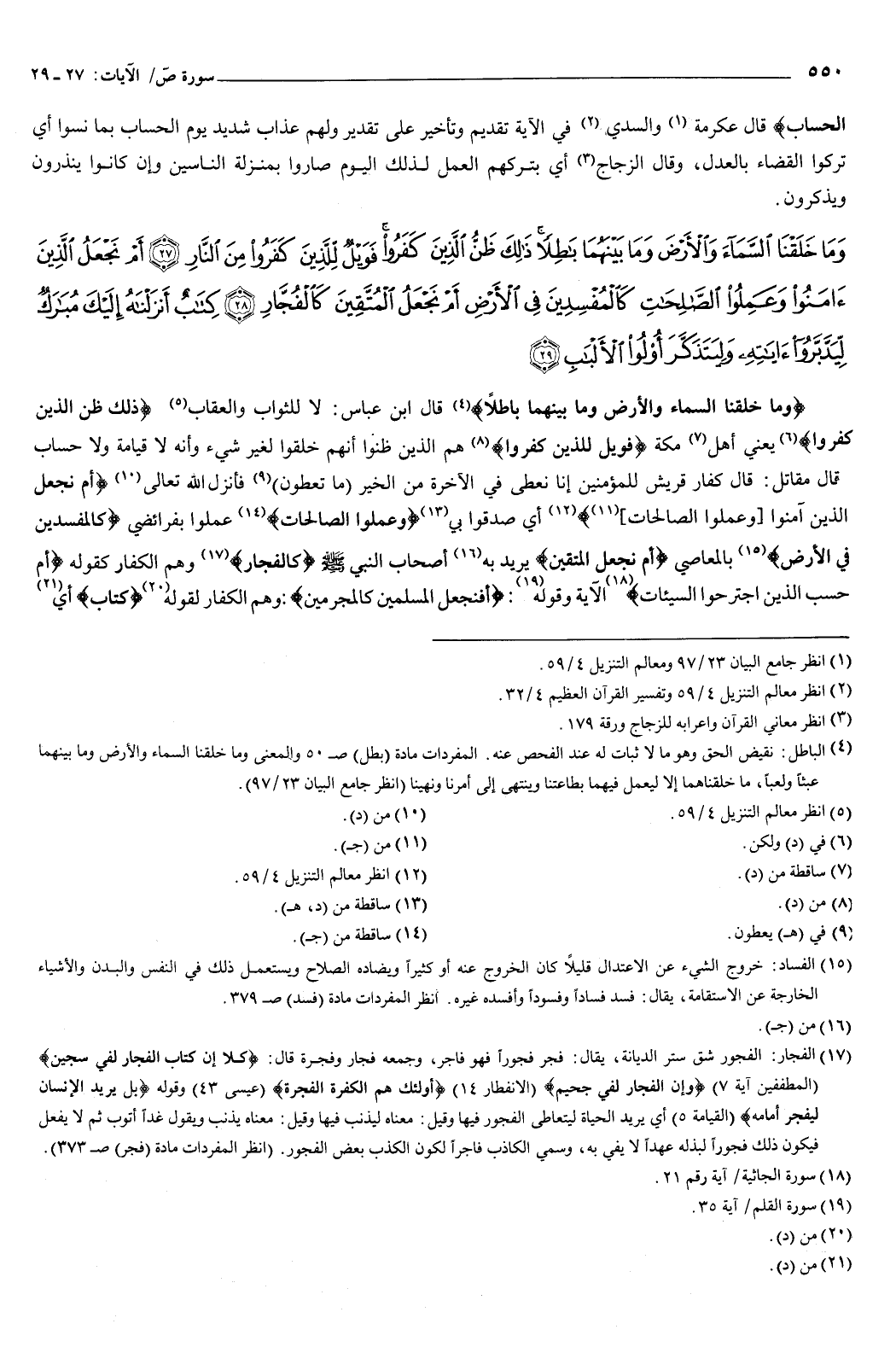 {وَمَا خَلَقْنَا السَّمَاءَ وَالأَرْضَ وَمَا بَيْنَهُمَا بَاطِلا ذَلِكَ ظَنُّ الَّذِينَ كَفَرُوا فَوَيْلٌ لِلَّذِينَ كَفَرُوا مِنَ النَّارِ {27} أَمْ نَجْعَلُ الَّذِينَ آمَنُوا وَعَمِلُوا الصَّالِحَاتِ كَالْمُفْسِدِينَ فِي الأَرْضِ أَمْ نَجْعَلُ الْمُتَّقِينَ كَالْفُجَّارِ {28} كِتَابٌ أَنْزَلْنَاهُ إِلَيْكَ مُبَارَكٌ لِيَدَّبَّرُوا آيَاتِهِ وَلِيَتَذَكَّرَ أُولُو الأَلْبَابِ {29} } [ص: 27-29] {وَمَا خَلَقْنَا السَّمَاءَ وَالأَرْضَ وَمَا بَيْنَهُمَا بَاطِلا} [ص: 27] قال ابن عباس: لا للثواب والعقاب.