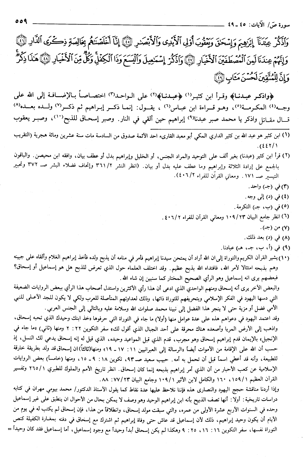 وَاذْكُرْ عِبَادَنَا إِبْرَاهِيمَ وَإِسْحَاقَ وَيَعْقُوبَ أُولِي الأَيْدِي وَالأَبْصَارِ {45} إِنَّا أَخْلَصْنَاهُمْ بِخَالِصَةٍ ذِكْرَى الدَّارِ {46} وَإِنَّهُمْ عِنْدَنَا لَمِنَ الْمُصْطَفَيْنَ الأَخْيَارِ {47} وَاذْكُرْ إِسْمَاعِيلَ وَالْيَسَعَ وَذَا الْكِفْلِ وَكُلٌّ مِنَ الأَخْيَارِ {48} هَذَا ذِكْرٌ وَإِنَّ لِلْمُتَّقِينَ لَحُسْنَ مَآبٍ {49} } [ص: 45-49] واذكر عبادنا وقرأ ابن كثير عبدنا على الواحد اختصاصا بالإضافة إلى الله على وجه المكرمة، وهو قراءة ابن عباس، يقول: إنما ذكر إبراهيم، ثم ذكر ولده بعده.