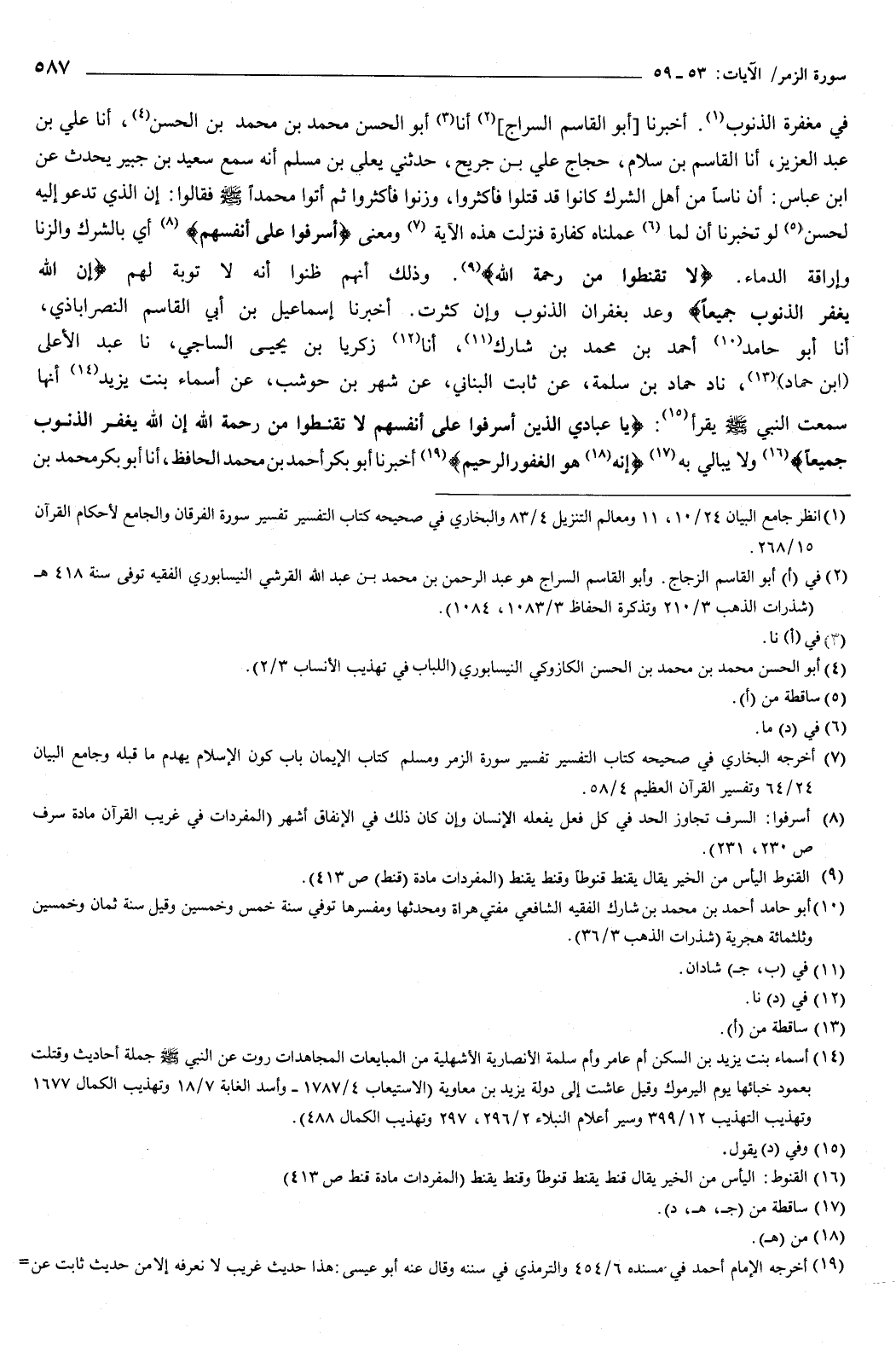803 - أَخْبَرَنَا إِسْمَاعِيلُ بْنُ أَبِي الْقَاسِمِ النَّصْرَابَاذِيُّ، أنا أَبُو حَامِدٍ أَحْمَدُ بْنُ مُحَمَّدِ بْنِ شَارِكٍ، أنا زَكَرِيَّا بْنُ يَحْيَى السَّاجِيُّ، نا عَبْدُ الأَعْلَى بْنُ حَمَّادٍ، نا حَمَّادُ بْنُ سَلَمَةَ، عَنْ ثَابِتٍ الْبُنَانِيِّ، عَنْ شَهْرِ بِن حَوْشَبٍ، عَنْ أَسْمَاءَ بِنْتِ يَزِيدَ، أَنَّهَا سَمِعَتِ النَّبِيَّ، صَلَّى اللهُ عَلَيْهِ وَسَلَّمَ، يَقْرَأُ: {يَا عِبَادِيَ الَّذِينَ أَسْرَفُوا عَلَى أَنْفُسِهِمْ لا تَقْنَطُوا مِنْ رَحْمَةِ اللَّهِ إِنَّ اللَّهَ يَغْفِرُ الذُّنُوبَ جَمِيعًا} وَلا يُبَالِي بِهِ {إِنَّهُ هُوَ الْغَفُورُ الرَّحِيمُ}