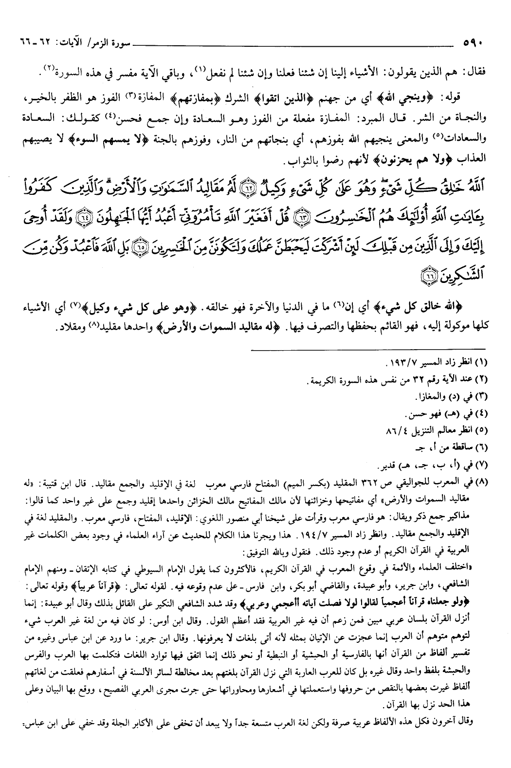 {اللَّهُ خَالِقُ كُلِّ شَيْءٍ وَهُوَ عَلَى كُلِّ شَيْءٍ وَكِيلٌ {62} لَهُ مَقَالِيدُ السَّمَوَاتِ وَالأَرْضِ وَالَّذِينَ كَفَرُوا بِآيَاتِ اللَّهِ أُولَئِكَ هُمُ الْخَاسِرُونَ {63} قُلْ أَفَغَيْرَ اللَّهِ تَأْمُرُونِّي أَعْبُدُ أَيُّهَا الْجَاهِلُونَ {64} وَلَقَدْ أُوحِيَ إِلَيْكَ وَإِلَى الَّذِينَ مِنْ قَبْلِكَ لَئِنْ أَشْرَكْتَ لَيَحْبَطَنَّ عَمَلُكَ وَلَتَكُونَنَّ مِنَ الْخَاسِرِينَ {65} بَلِ اللَّهَ فَاعْبُدْ وَكُنْ مِنَ الشَّاكِرِينَ {66} } [الزمر: 62-66] {اللَّهُ خَالِقُ كُلِّ شَيْءٍ} [الزمر: 62] أي: إن ما في الدنيا والآخرة فهو خالقه، {وَهُوَ عَلَى كُلِّ شَيْءٍ وَكِيلٌ} [الزمر: 62] أي: الأشياء كلها موكولة إليه، فهو القائم بحفظها والتصرف فيها.